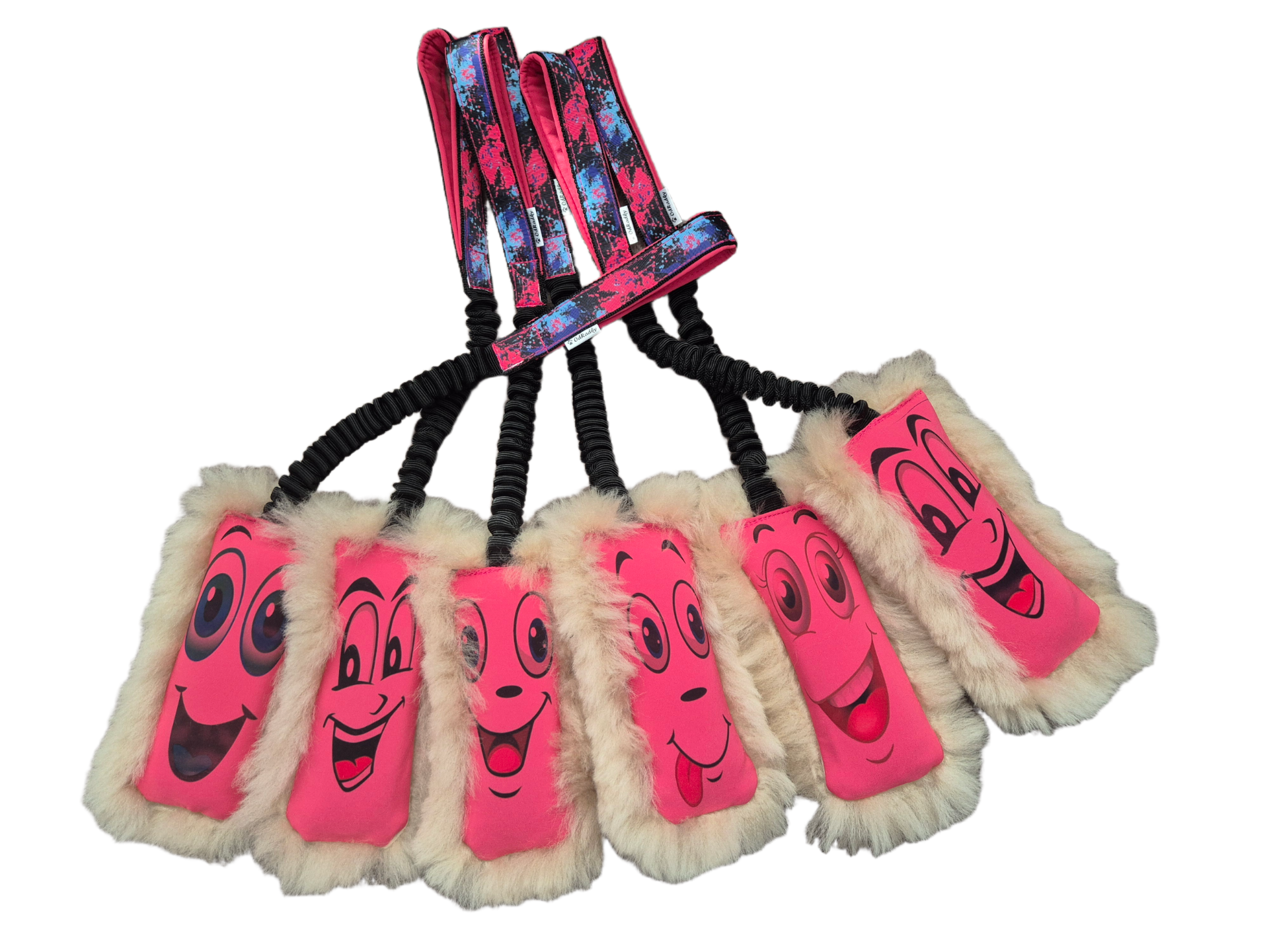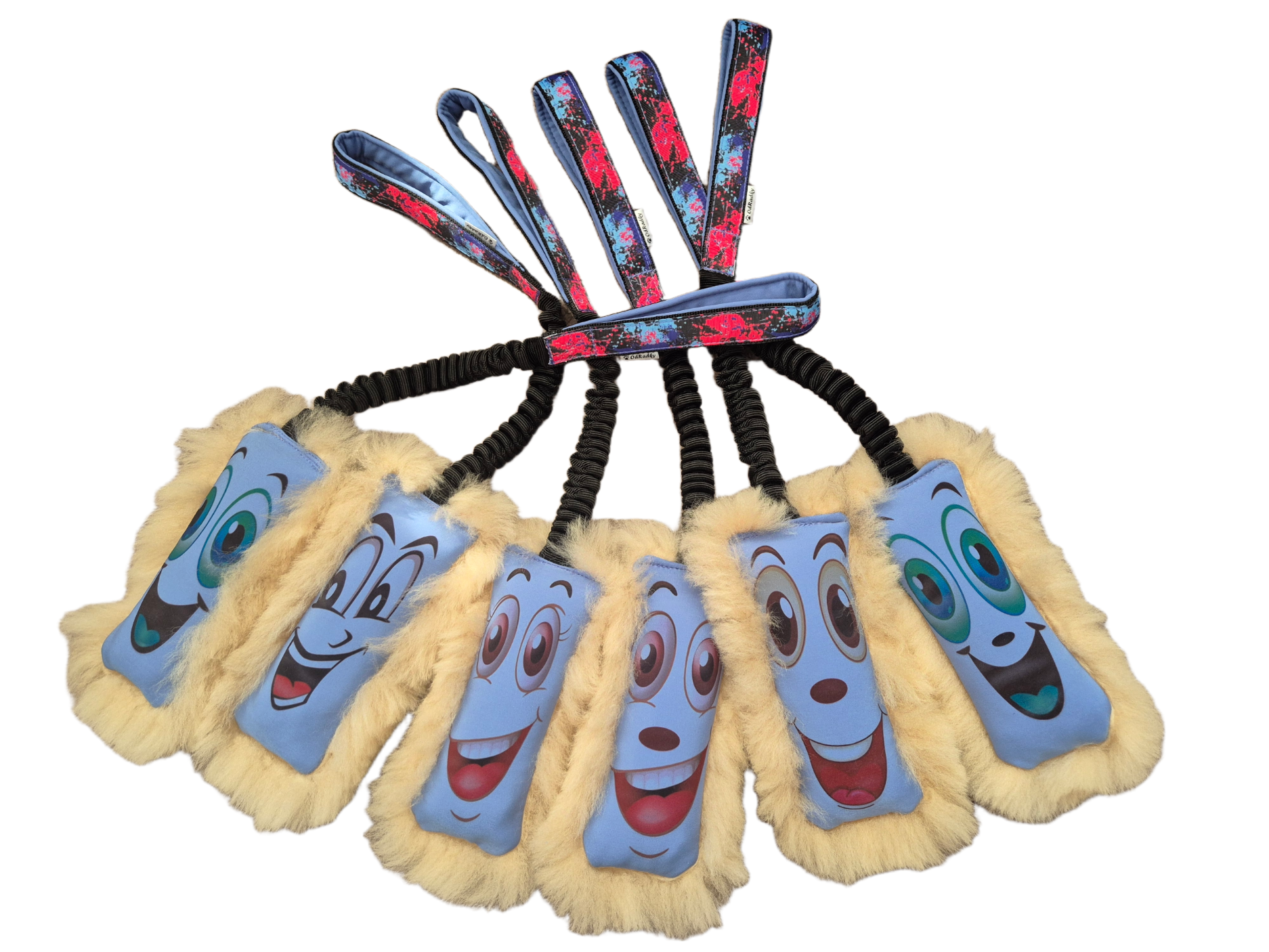 Přední strana softshel, zadní strana ovčí kožešina (velikost 7x17cm). Hračka obsahuje molitanovou výplň a lze doplnit pískátkem. Délka pružné ručky (amortizéru) 35cm po natažení cca 65. různá v rozmezí 70 - 90 cm.