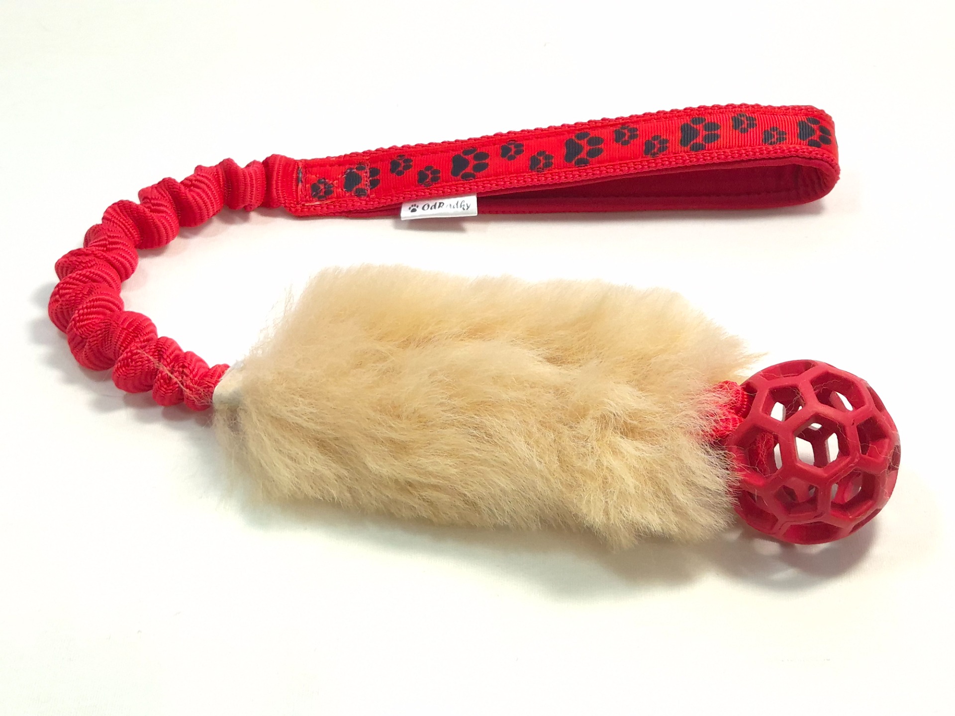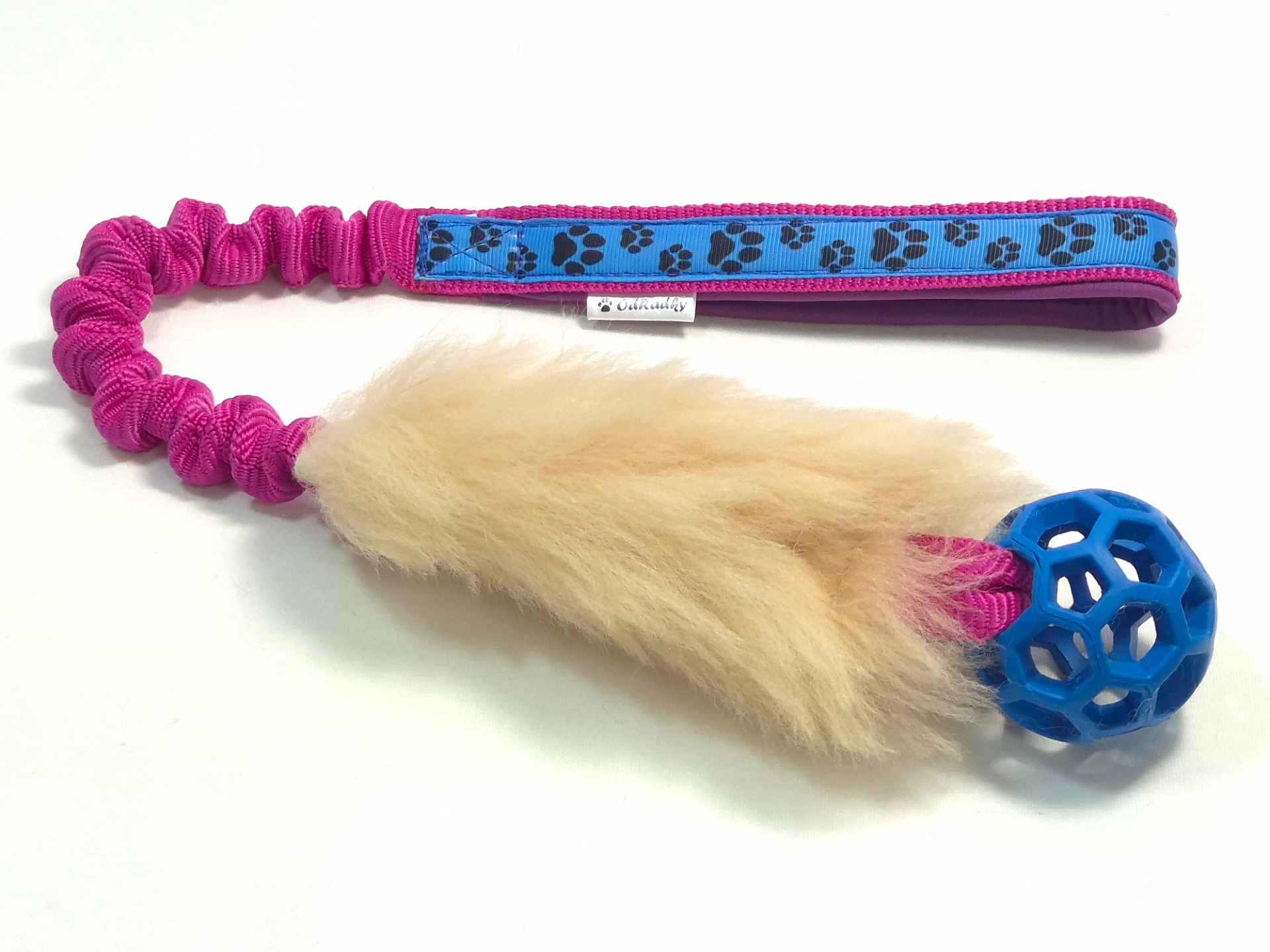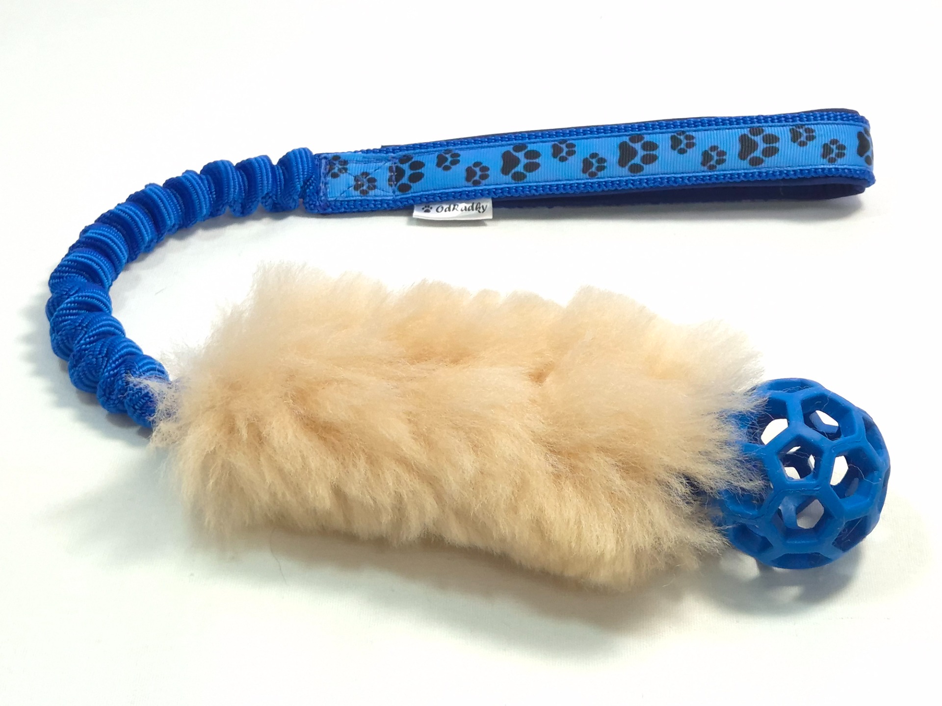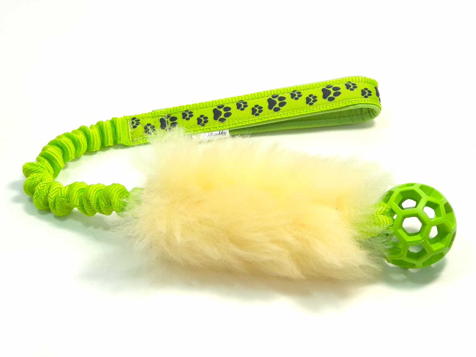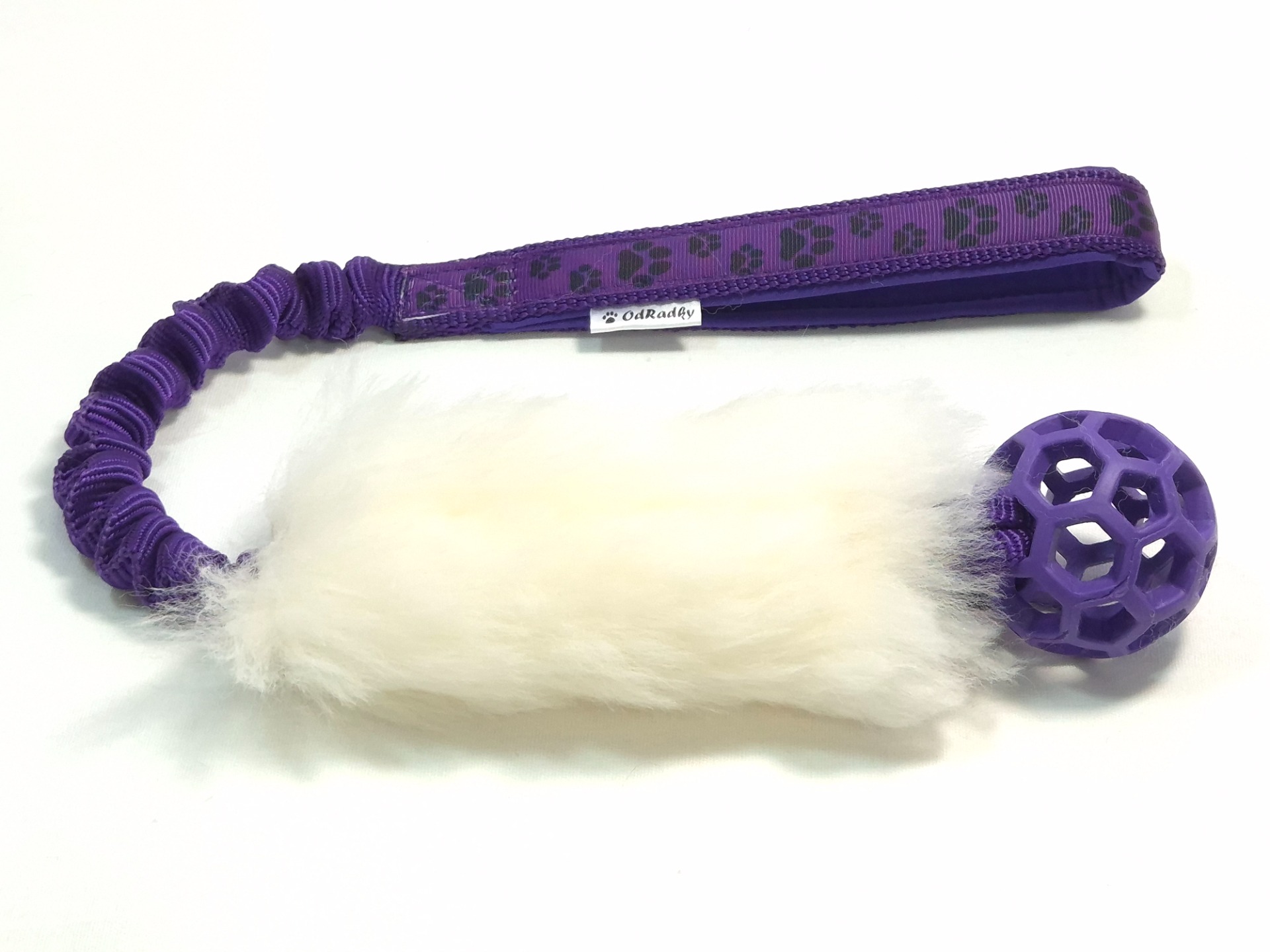 Vyrobeno z pravé ovčí kožešiny našité na  pružném popruhu (amortizéru), ručka je podšita softshellem a zakončeno JW míčkem mini.