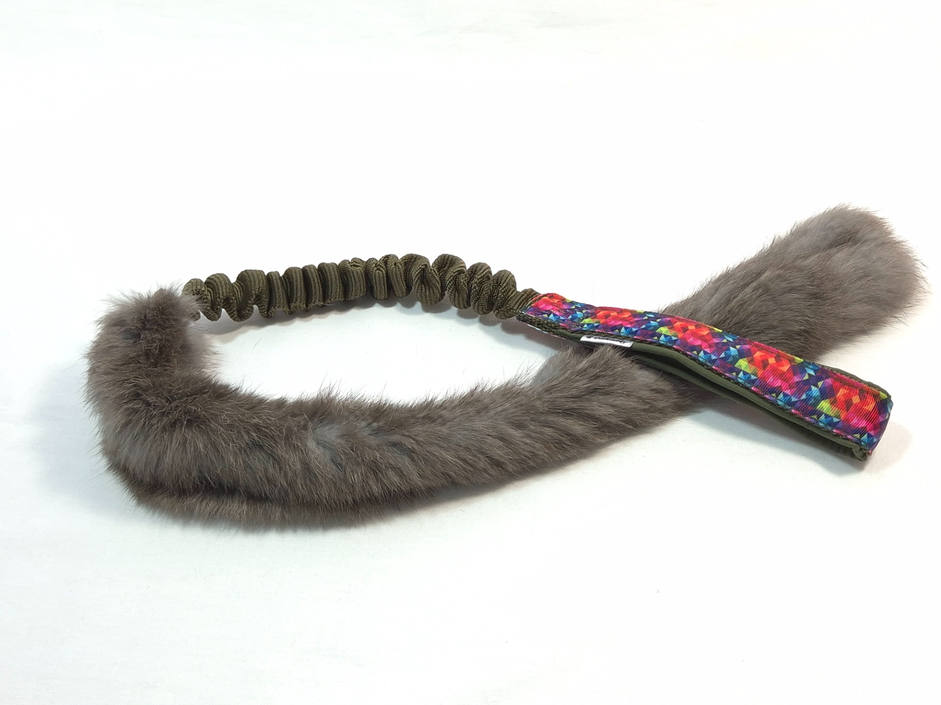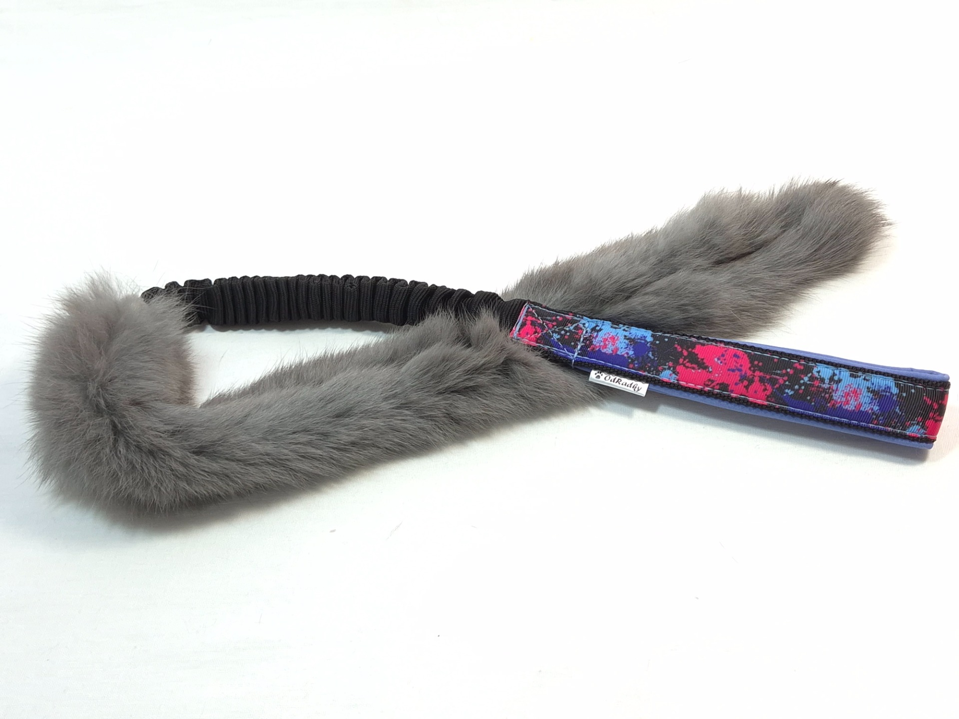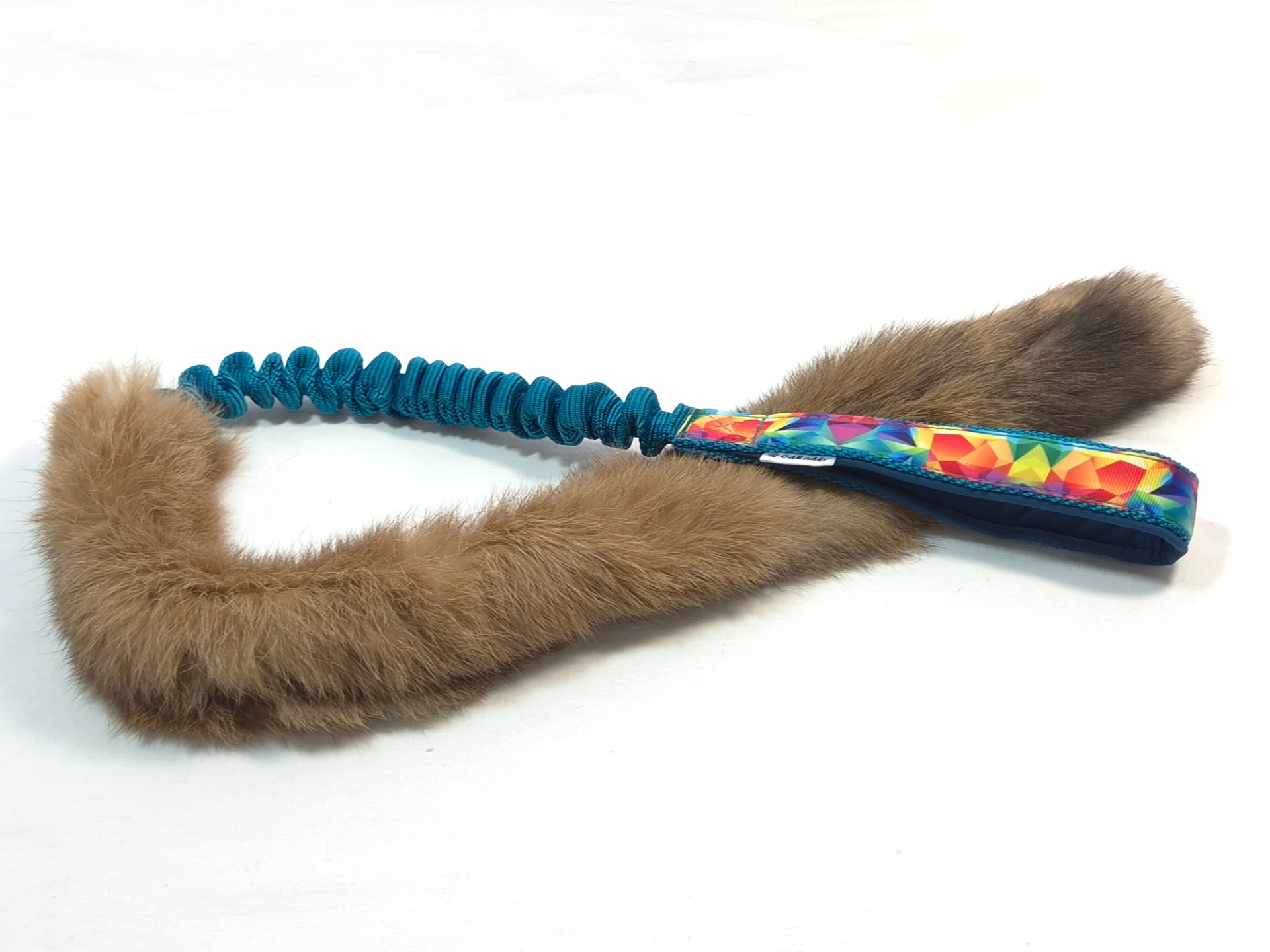 Přetahovadlo je vyrobeno z pravé králičí kožešiny našité na pružném popruhu (amortizéru) s rukojetí zdobenou stuhou a podšitou softshellem.