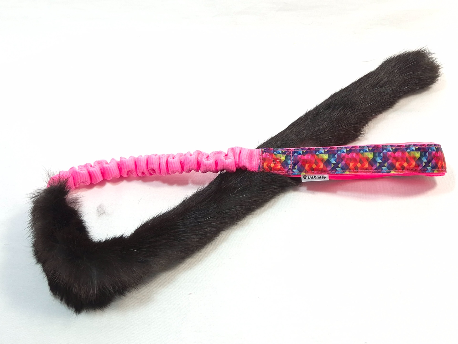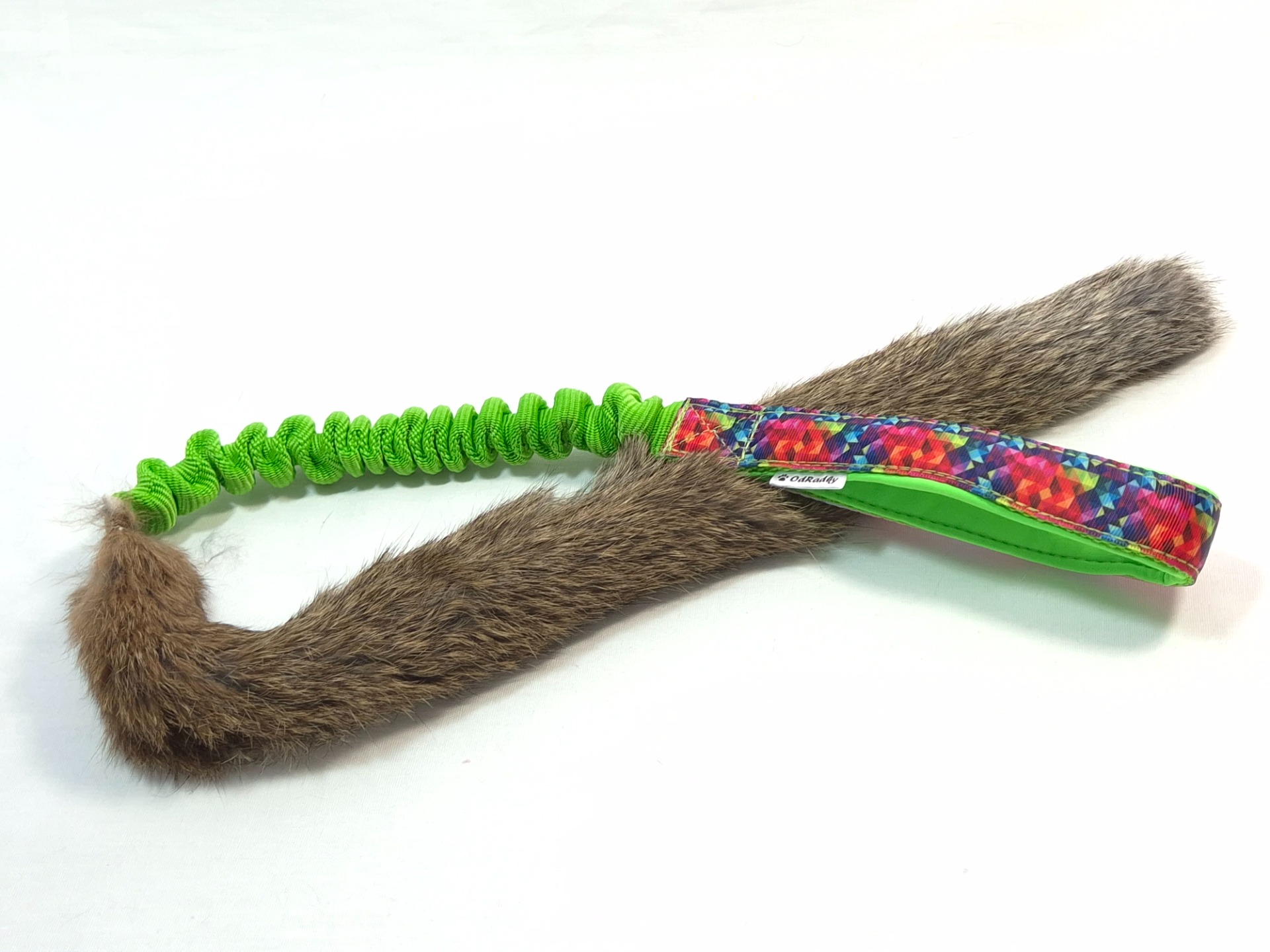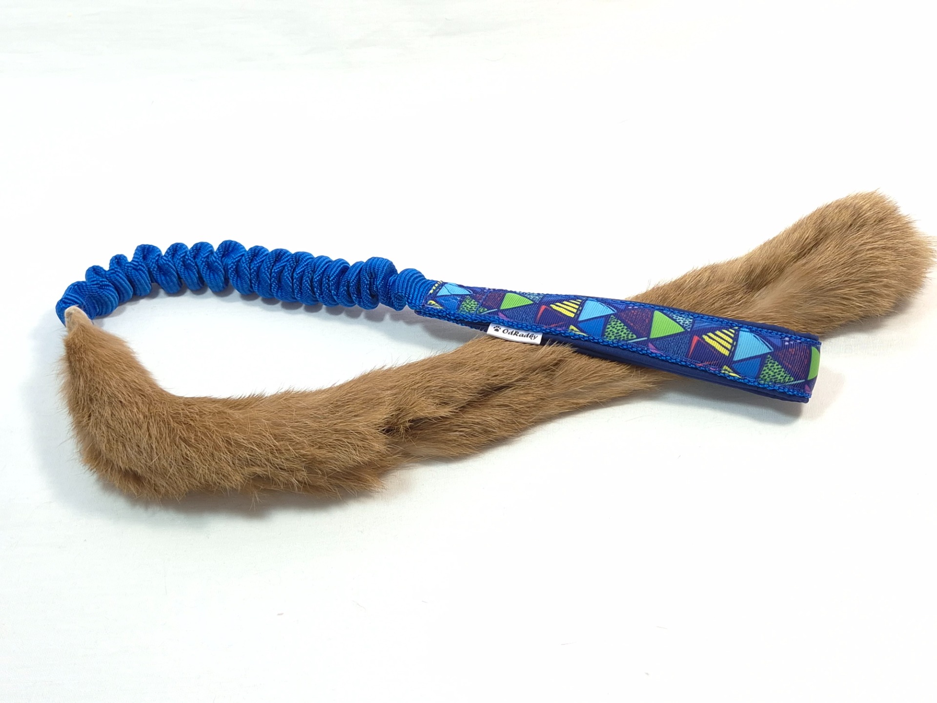 Přetahovadlo je vyrobeno z pravé králičí kožešiny našité na pružném popruhu (amortizéru) s rukojetí zdobenou stuhou a podšitou softshellem.
