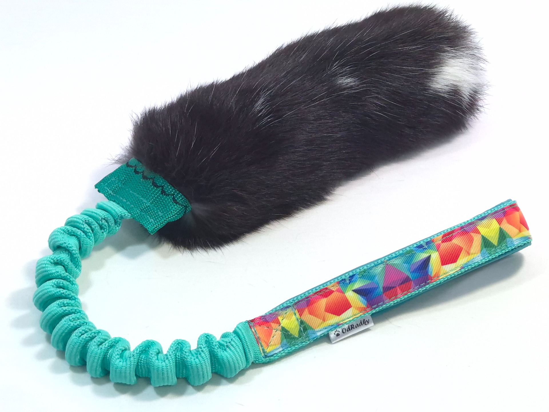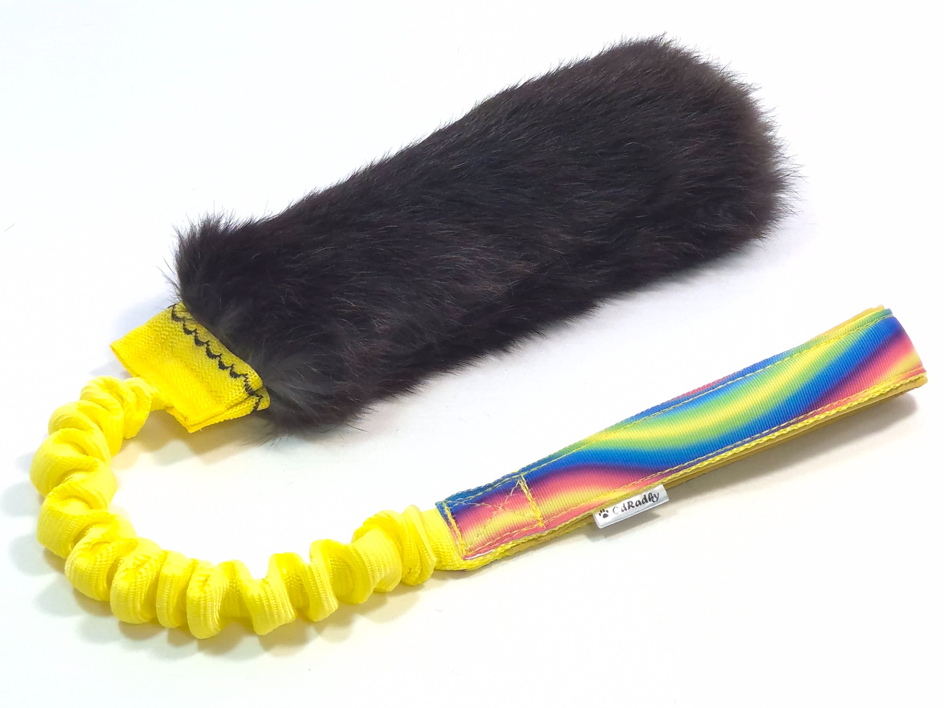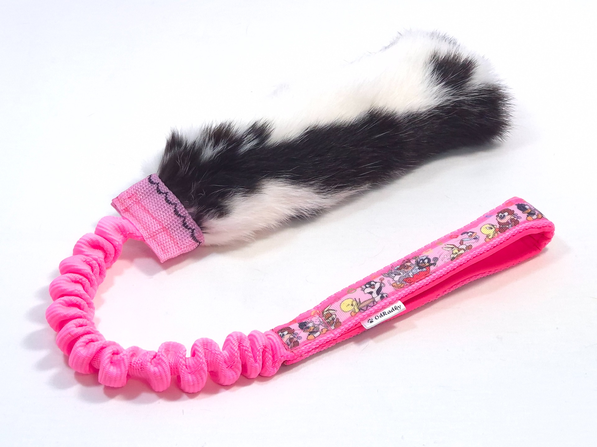 Pro větší pevnost vede popruh v celé délce hračky. Kožešinová část 20x7cm.Hračka obsahuje molitanovou výplň a lze doplnit pískátkem. Délka pružného popruh s ručkou (amortizéru) 35 cm, po natažení 60 cm, ručka je zdobená stuhou a podšitá softshellem.