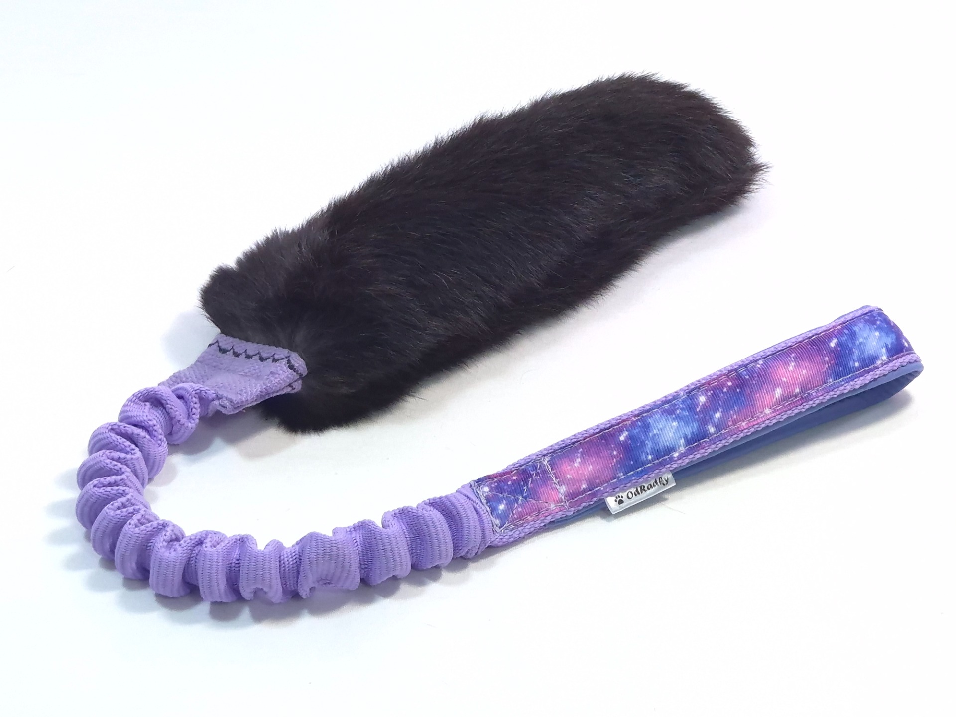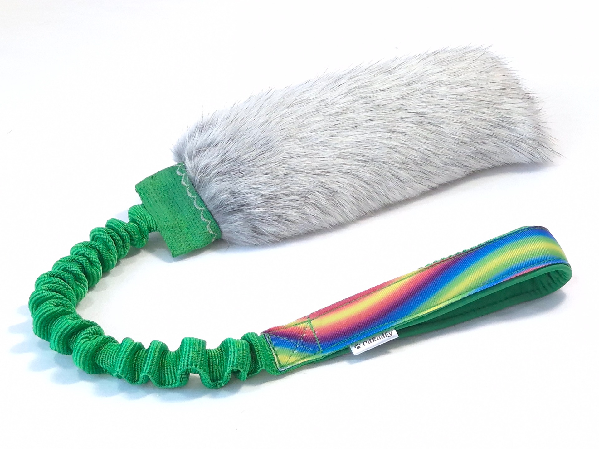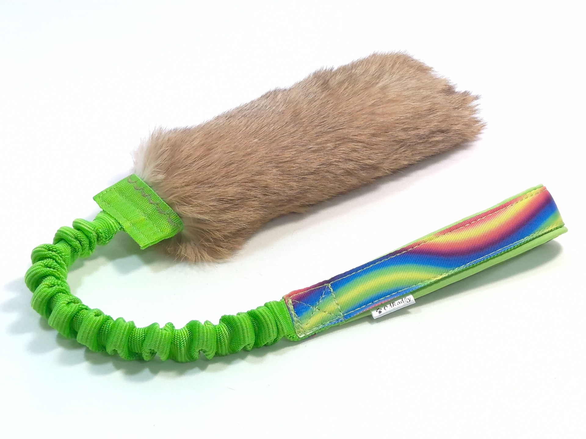 Pro větší pevnost vede popruh v celé délce hračky. Kožešinová část 20x7cm.Hračka obsahuje molitanovou výplň a lze doplnit pískátkem. Délka pružného popruh s ručkou (amortizéru) 35 cm, po natažení 60 cm, ručka je zdobená stuhou a podšitá softshellem.