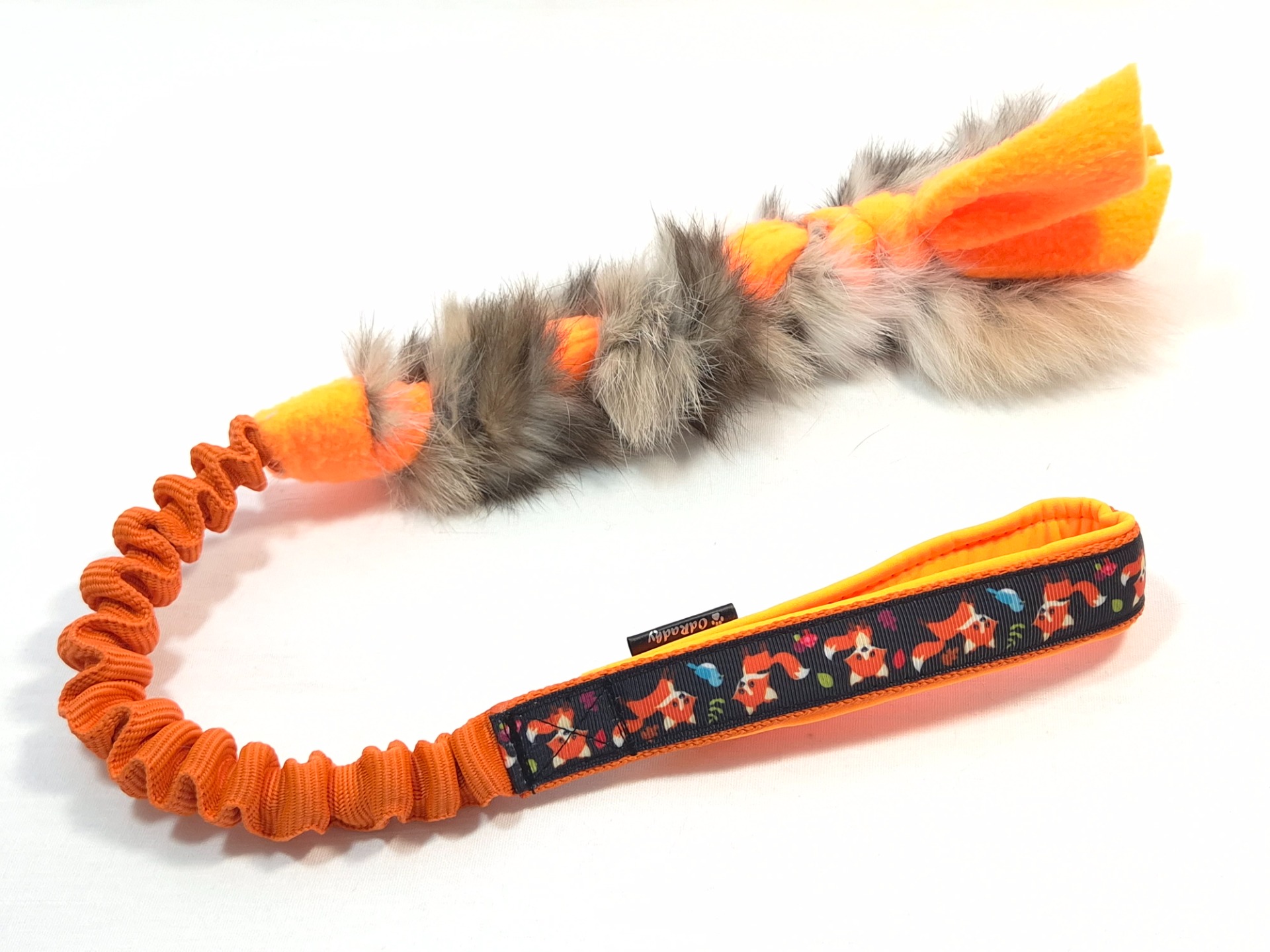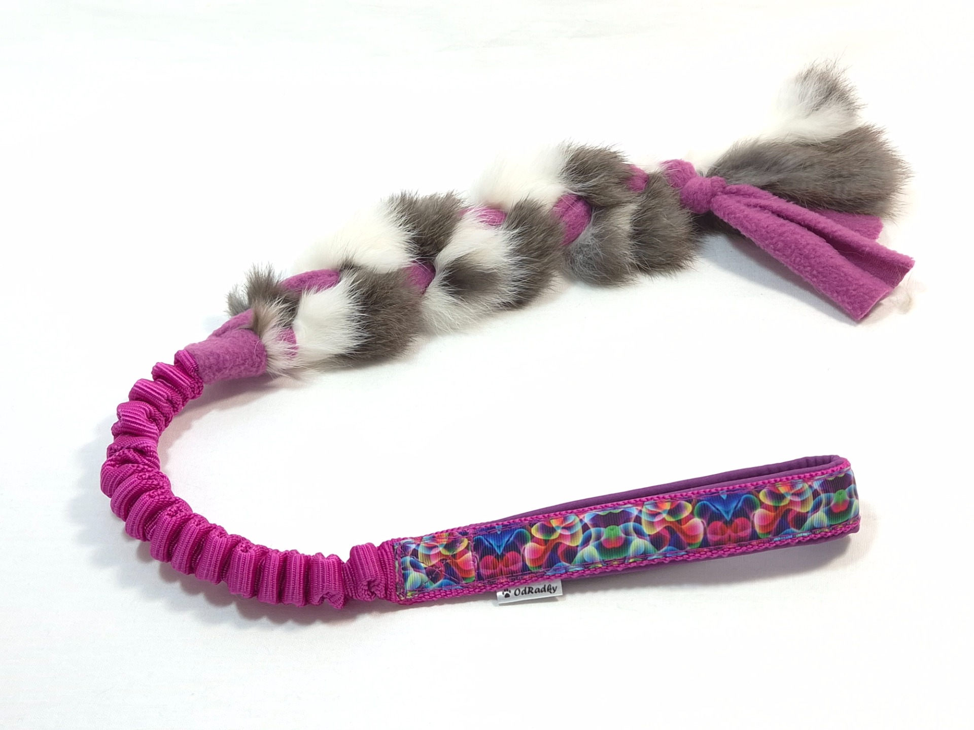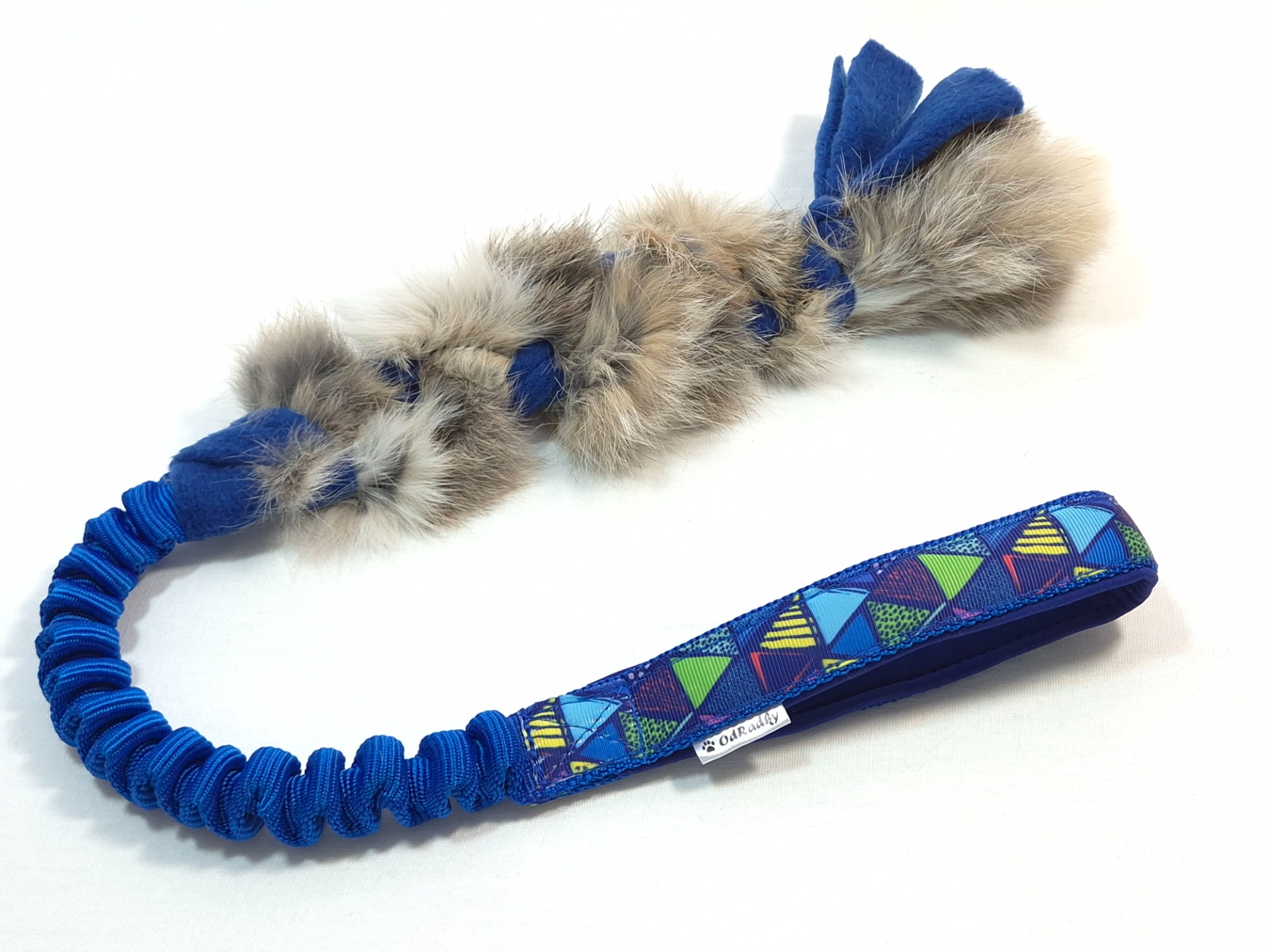 Přetahovadlo je vyrobeno z pravé králičí kožešiny, fleecu a pružného popruhu (amortizéru) s rukojetí zdobenou stuhou a podšitou softshellem.