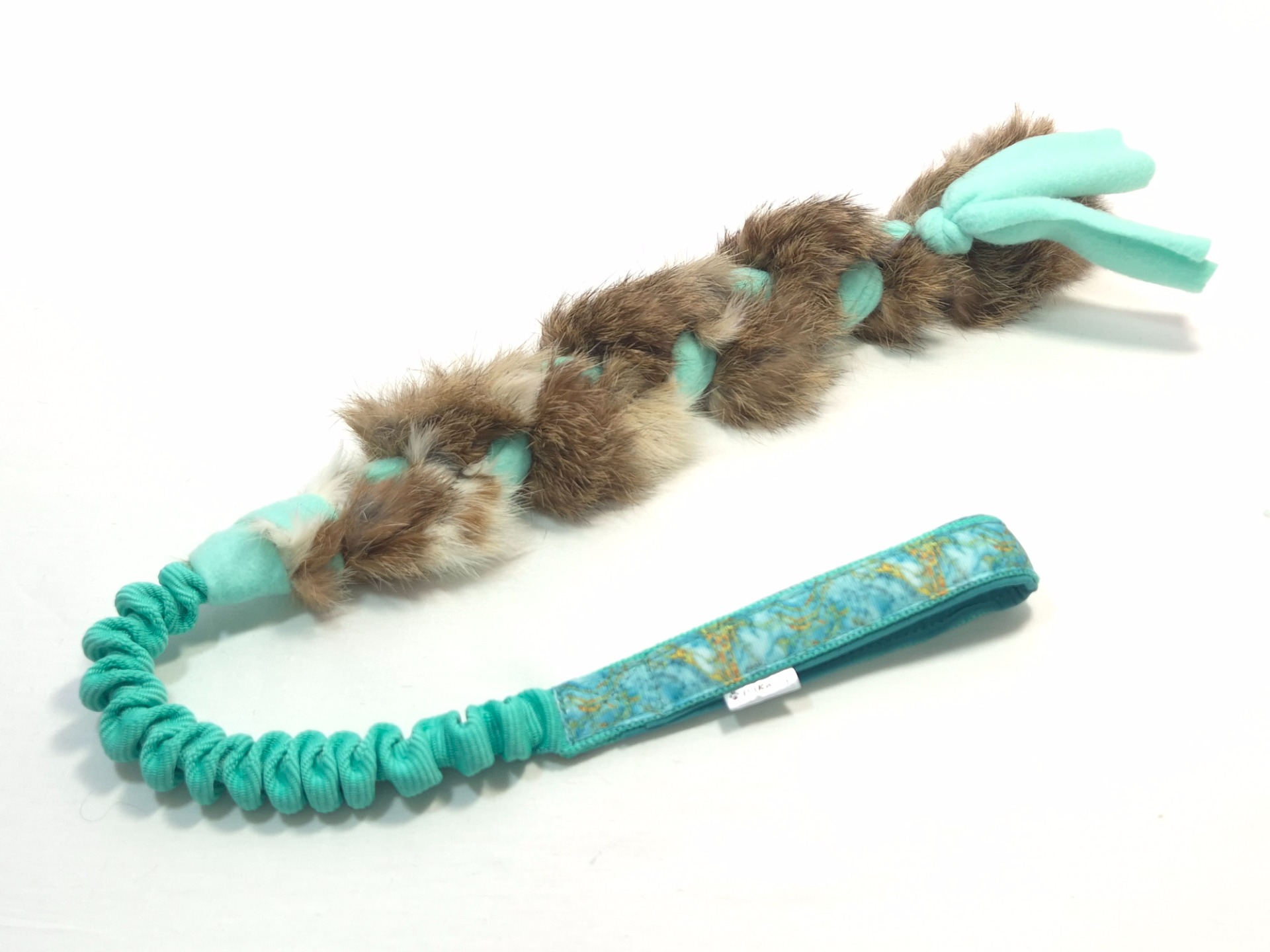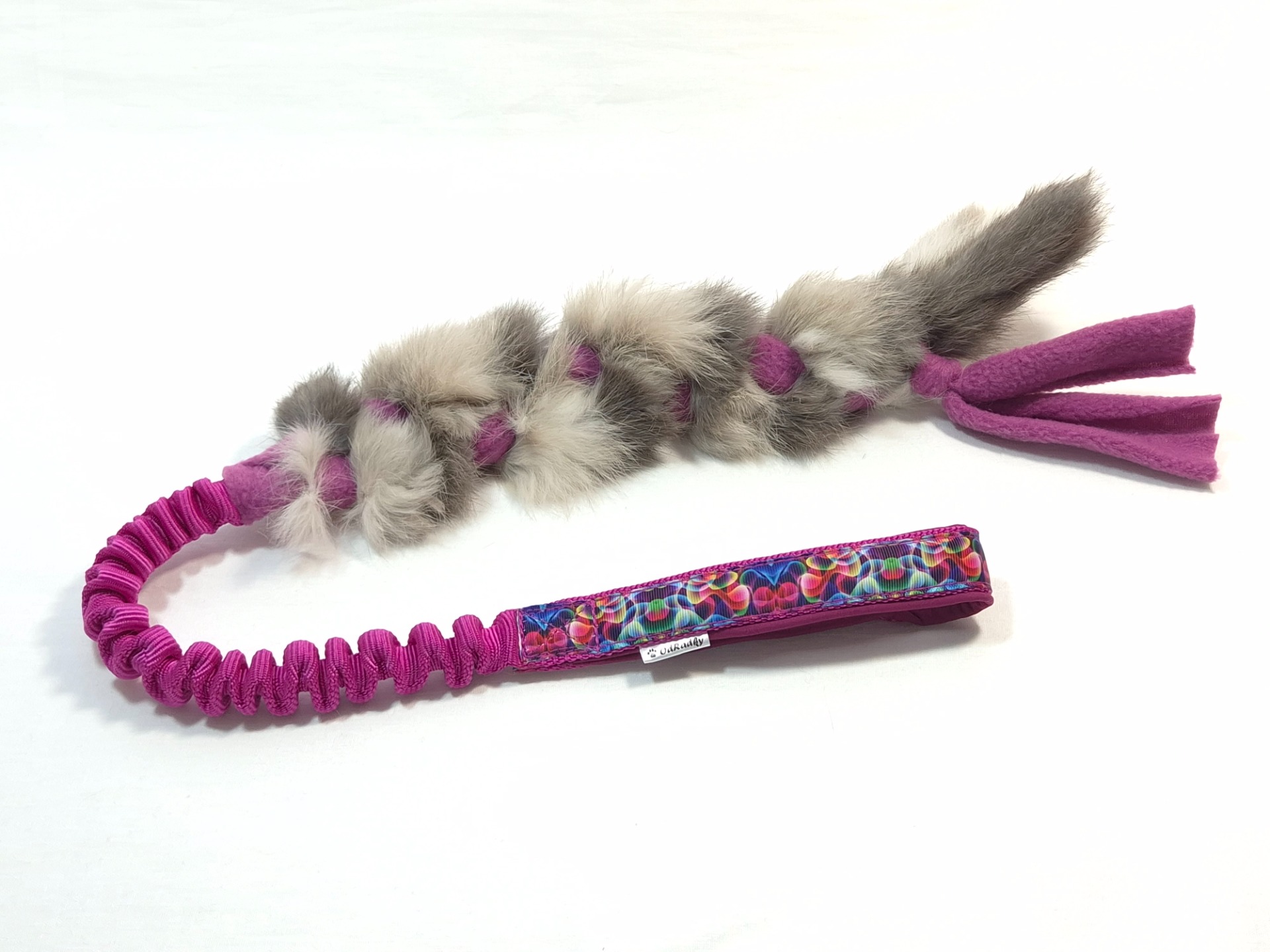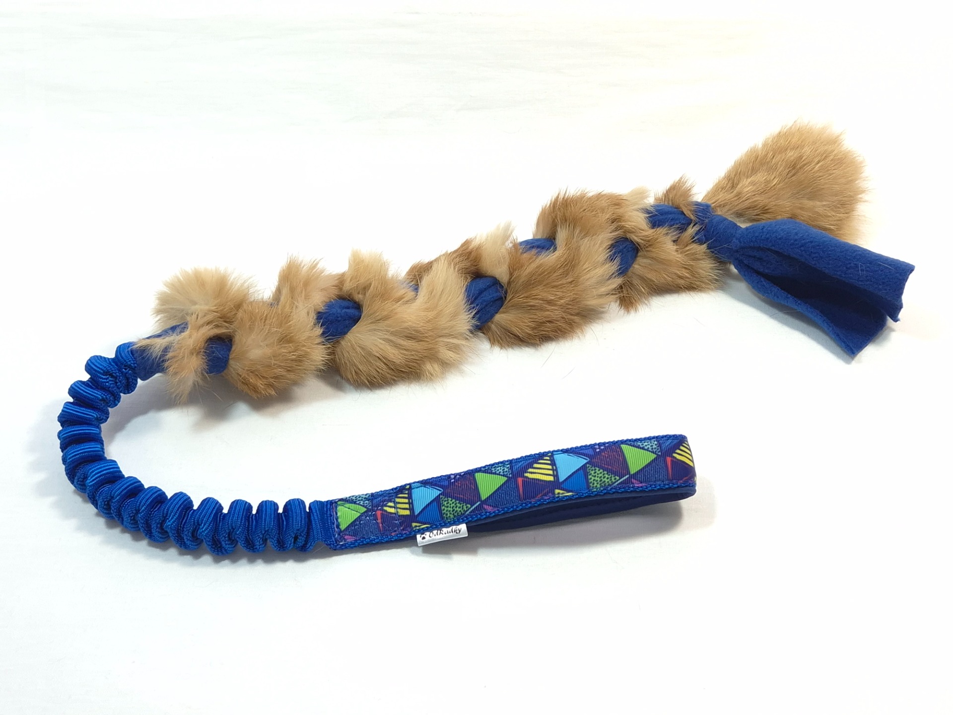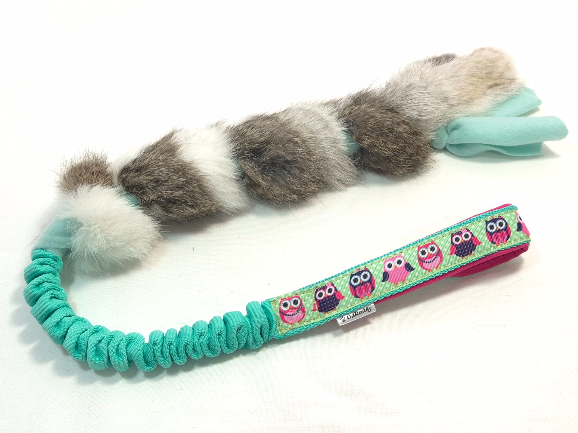 Přetahovadlo je vyrobeno z pravé králičí kožešiny, fleecu a pružného popruhu (amortizéru) s rukojetí zdobenou stuhou a podšitou softshellem.