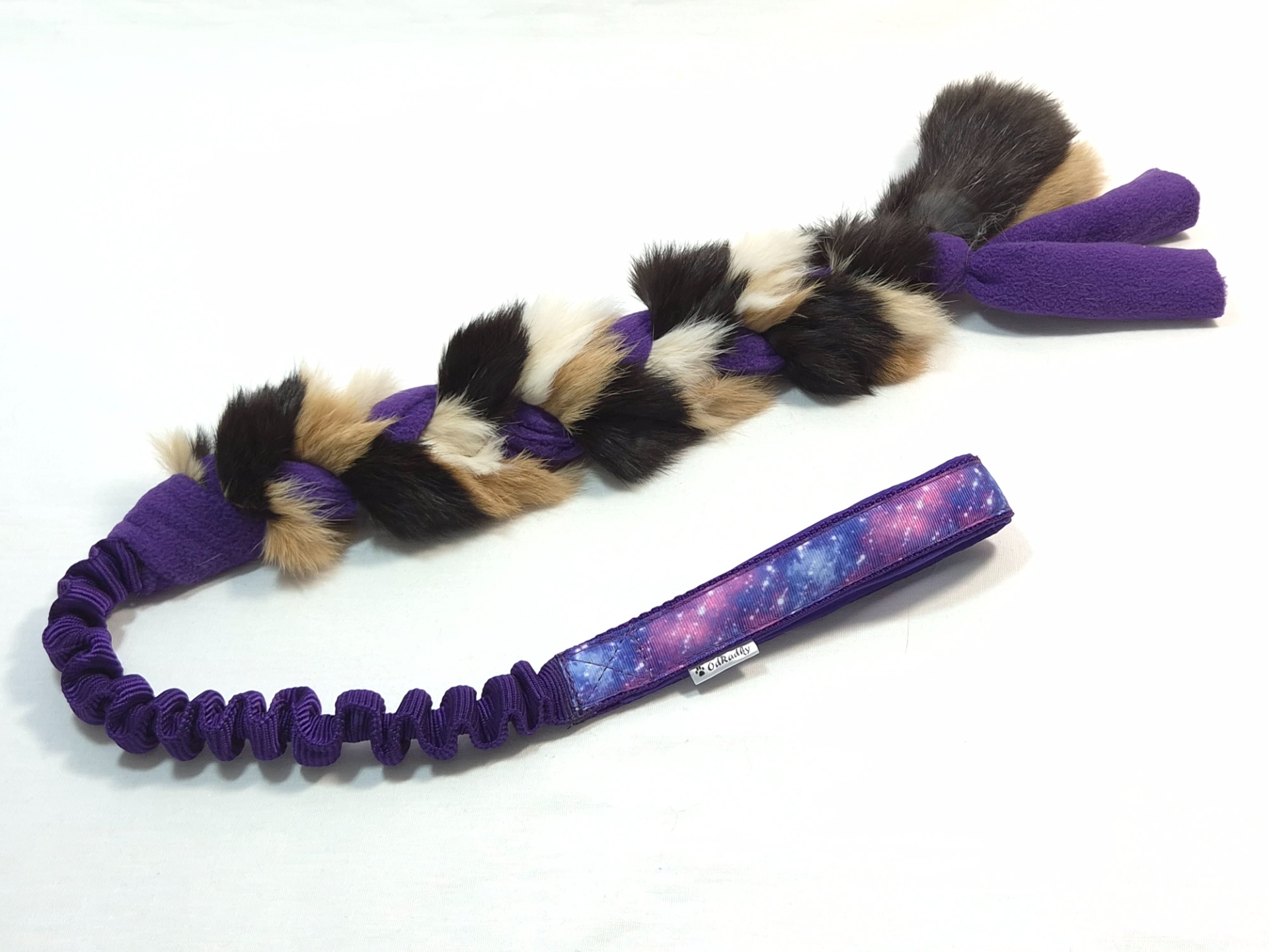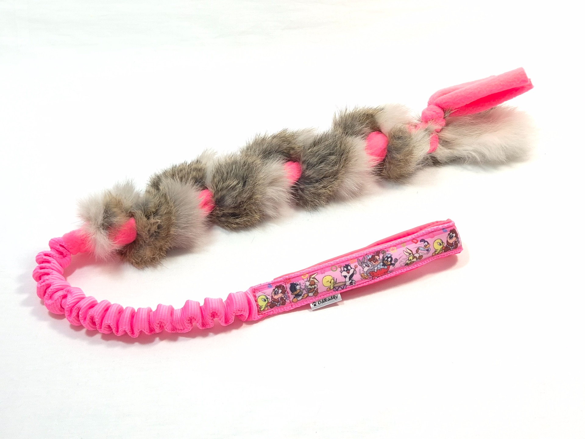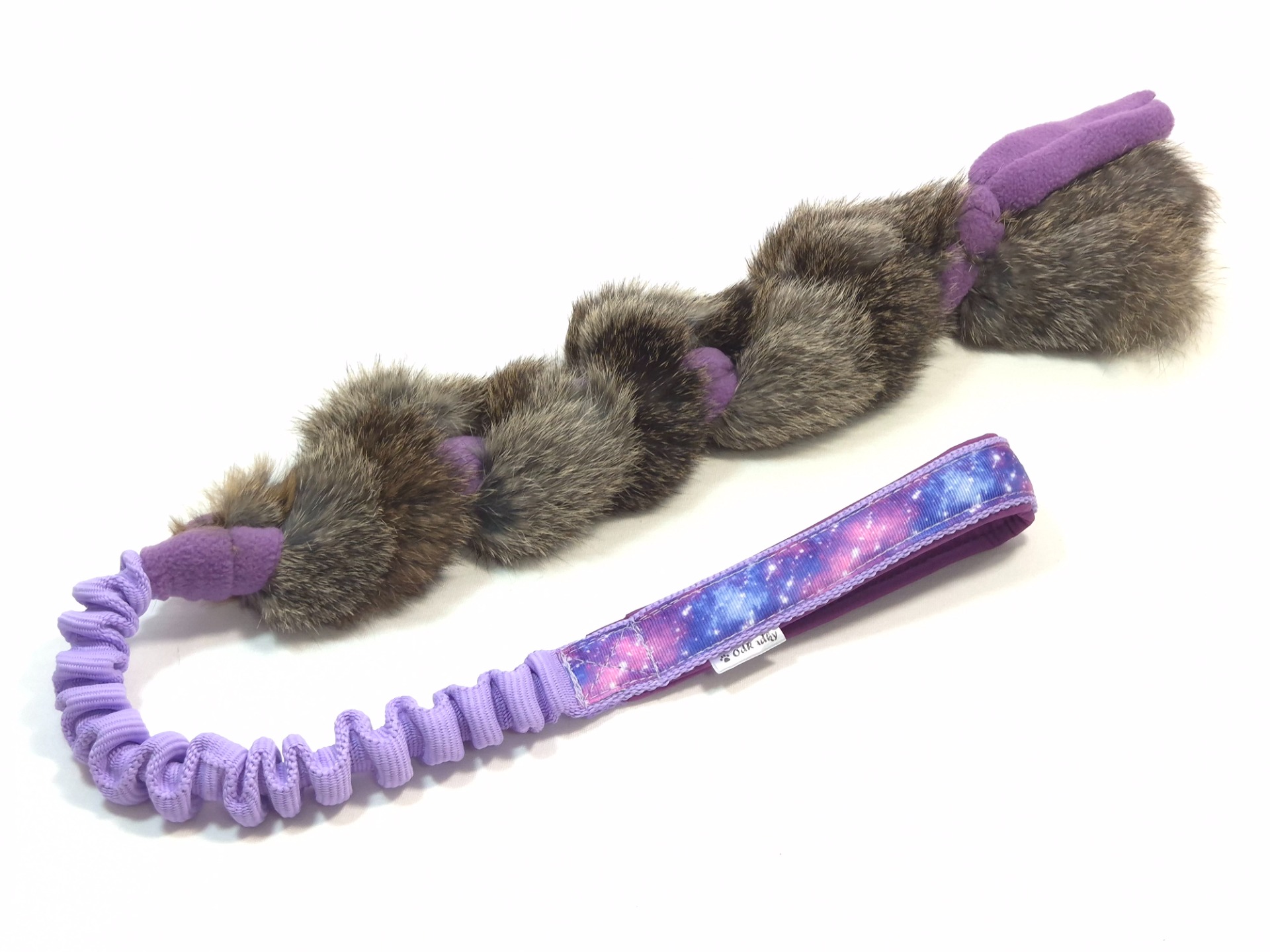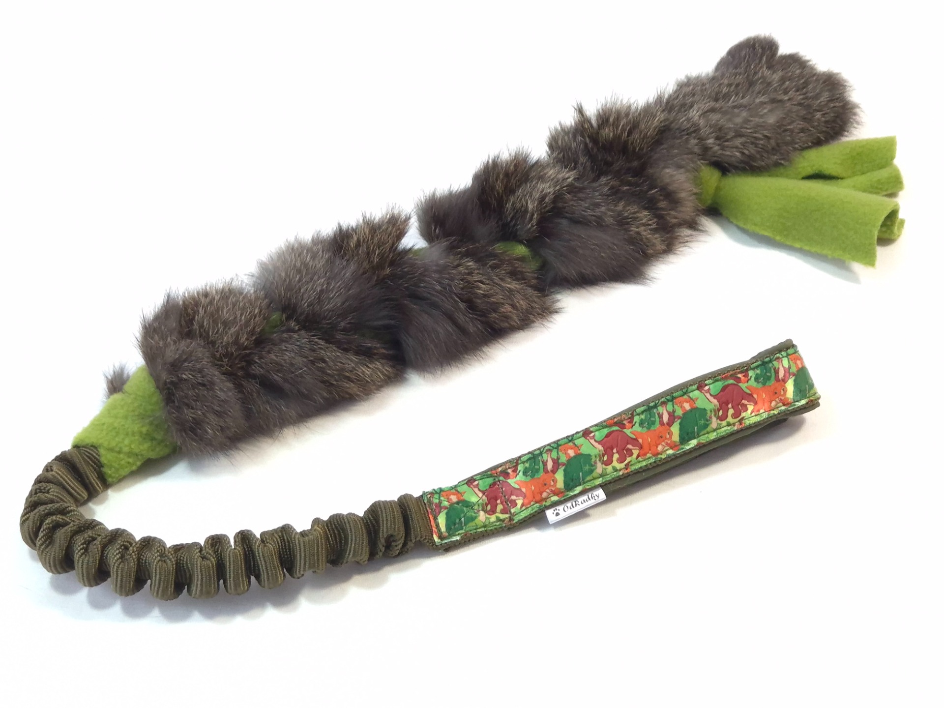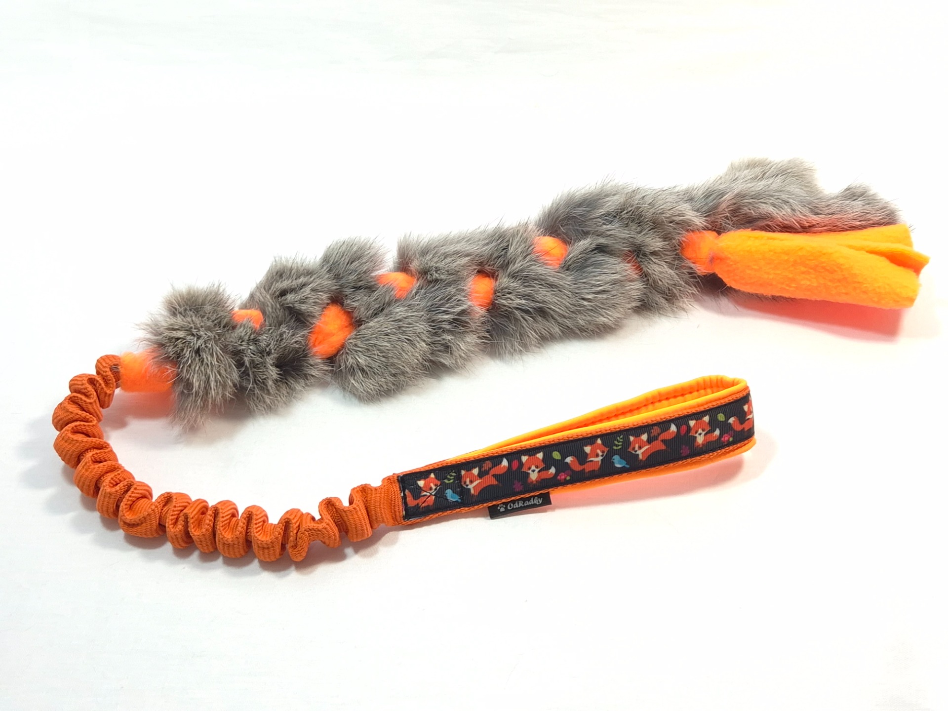 Přetahovadlo je vyrobeno z pravé králičí kožešiny, fleecu a pružného popruhu (amortizéru) s rukojetí zdobenou stuhou a podšitou softshellem.