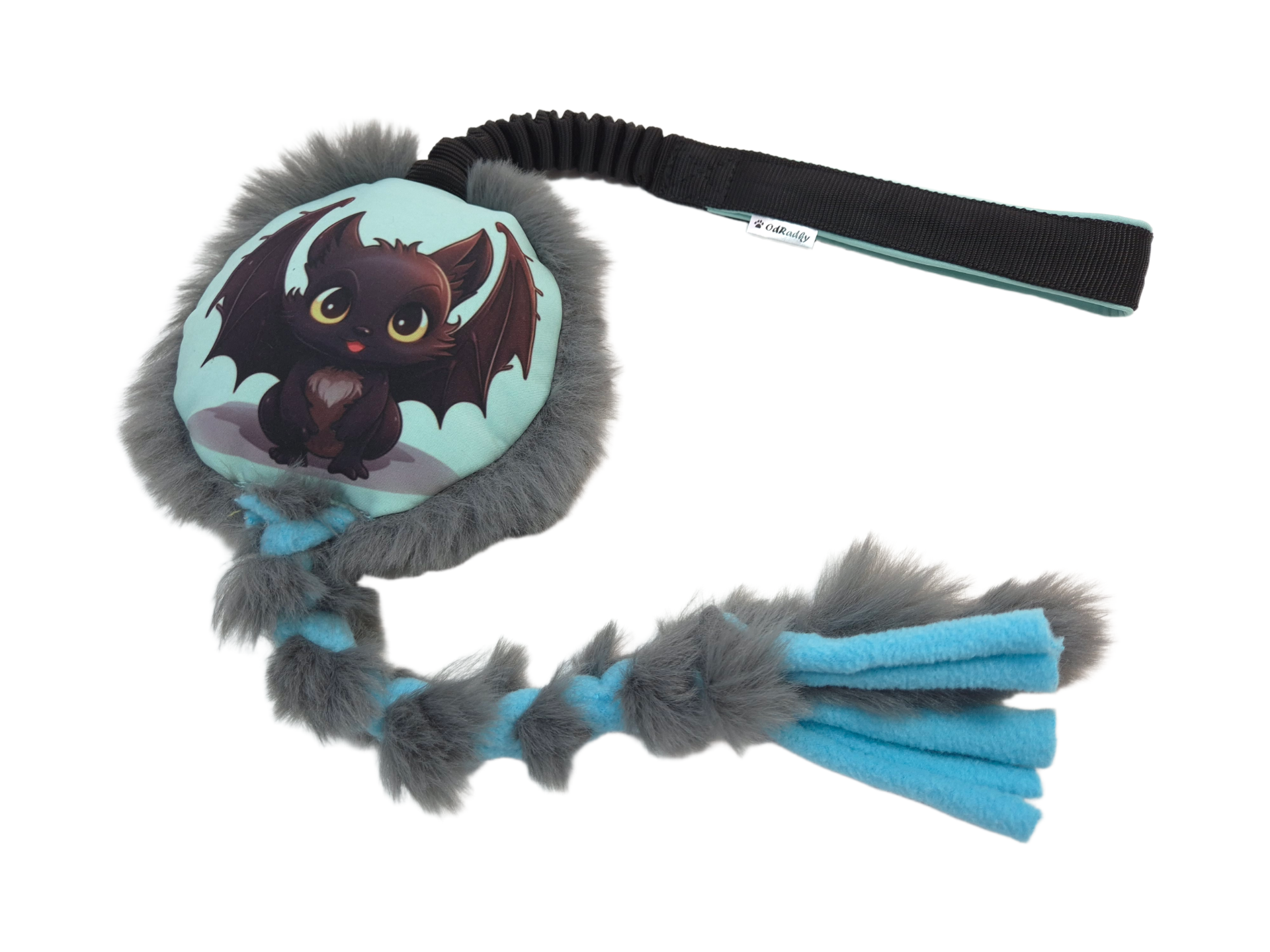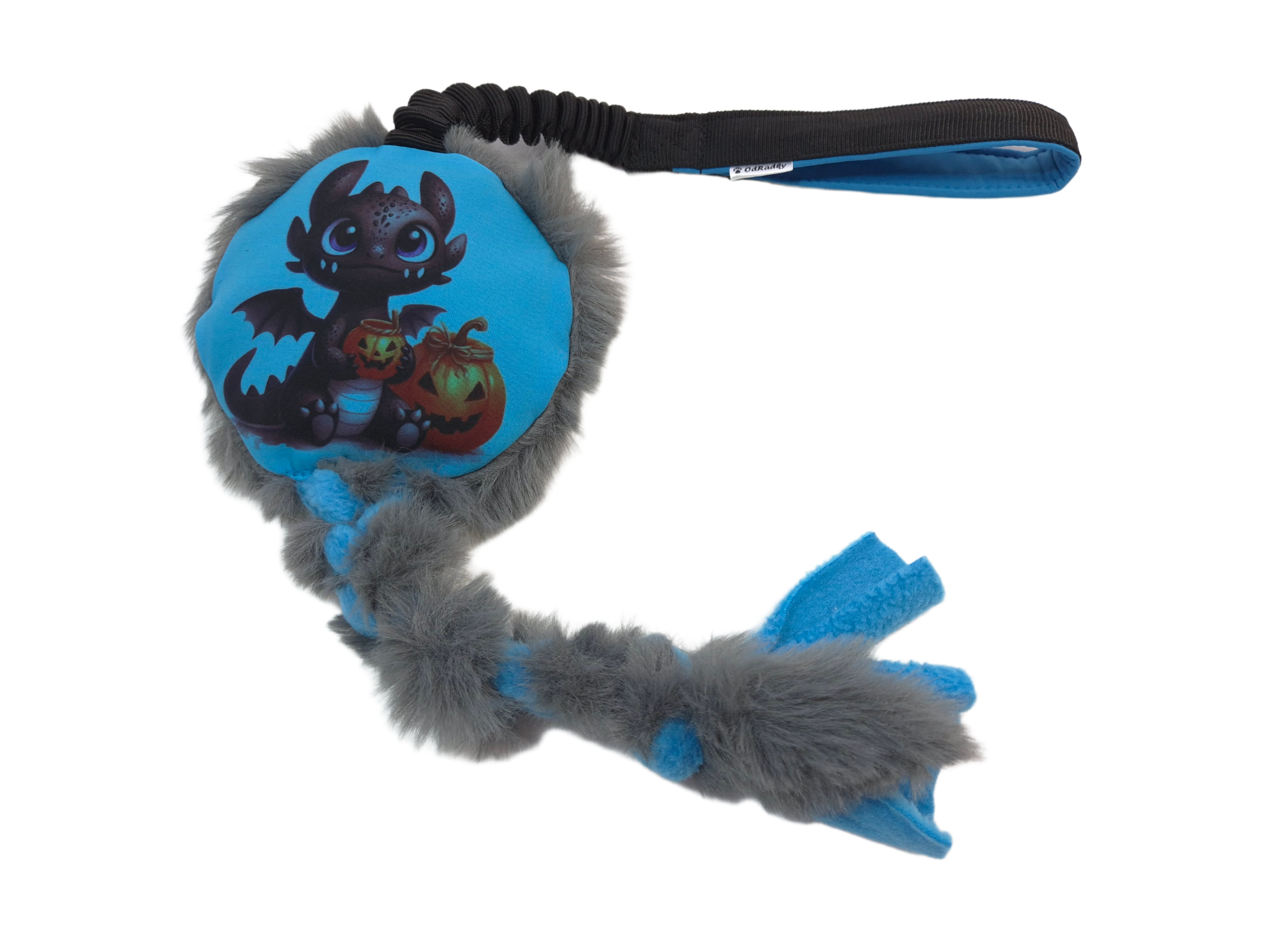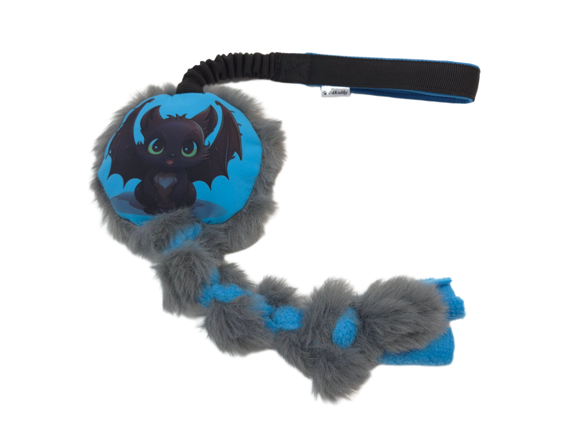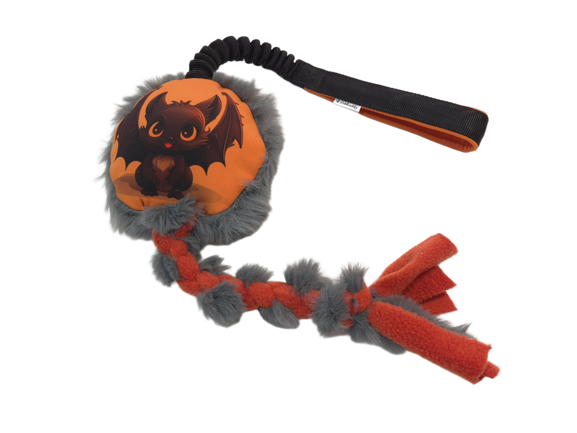 Přední strana softshel, zadní strana umělá kožešina, průměr okolo 14cm, cop z fleecu s umělou kožešinou o délce 25cm, pružná ručka ( amortizér) o délce 30 cm po natažení 50cm. Celková délka hračky okolo 65 cm.