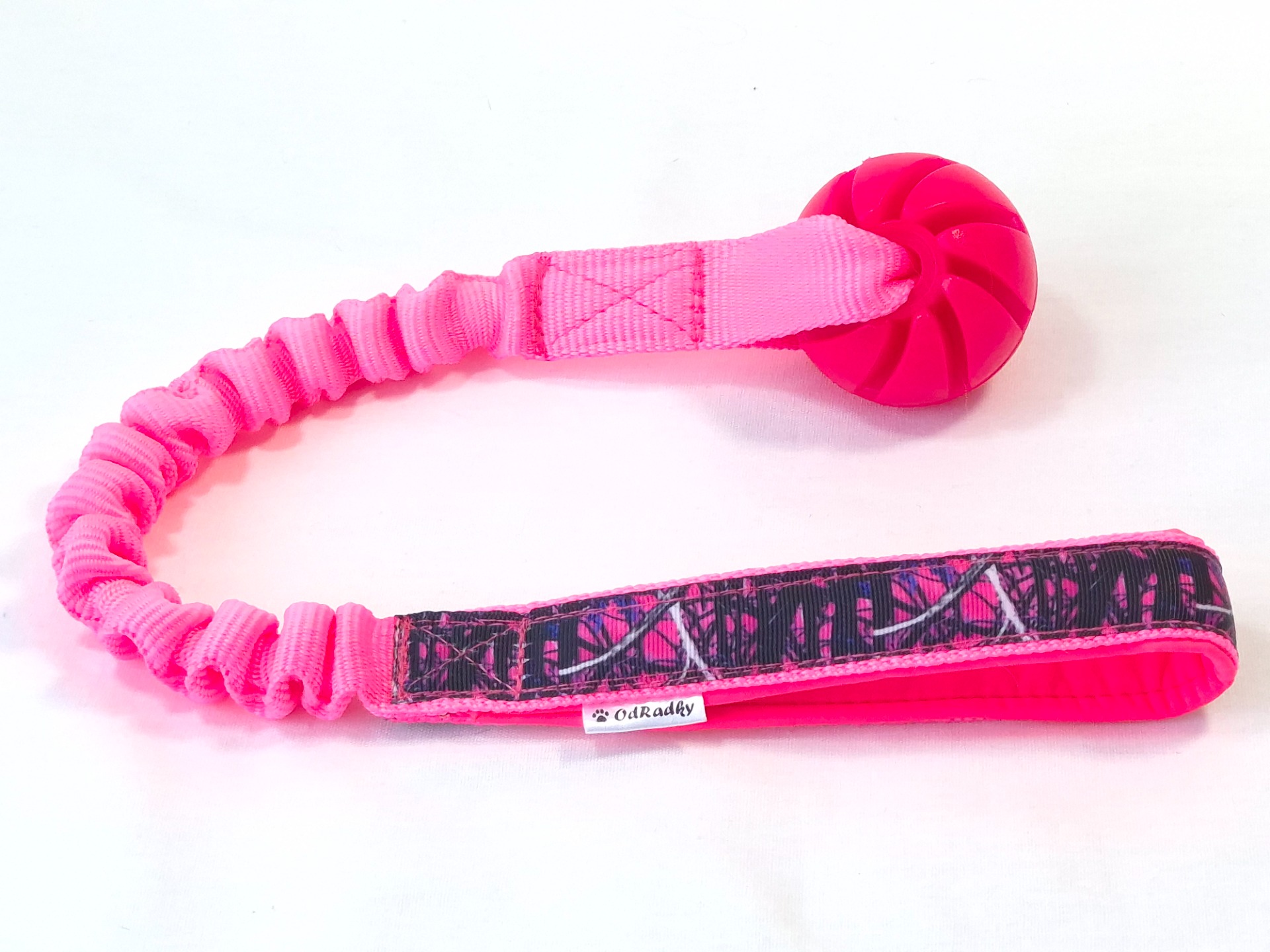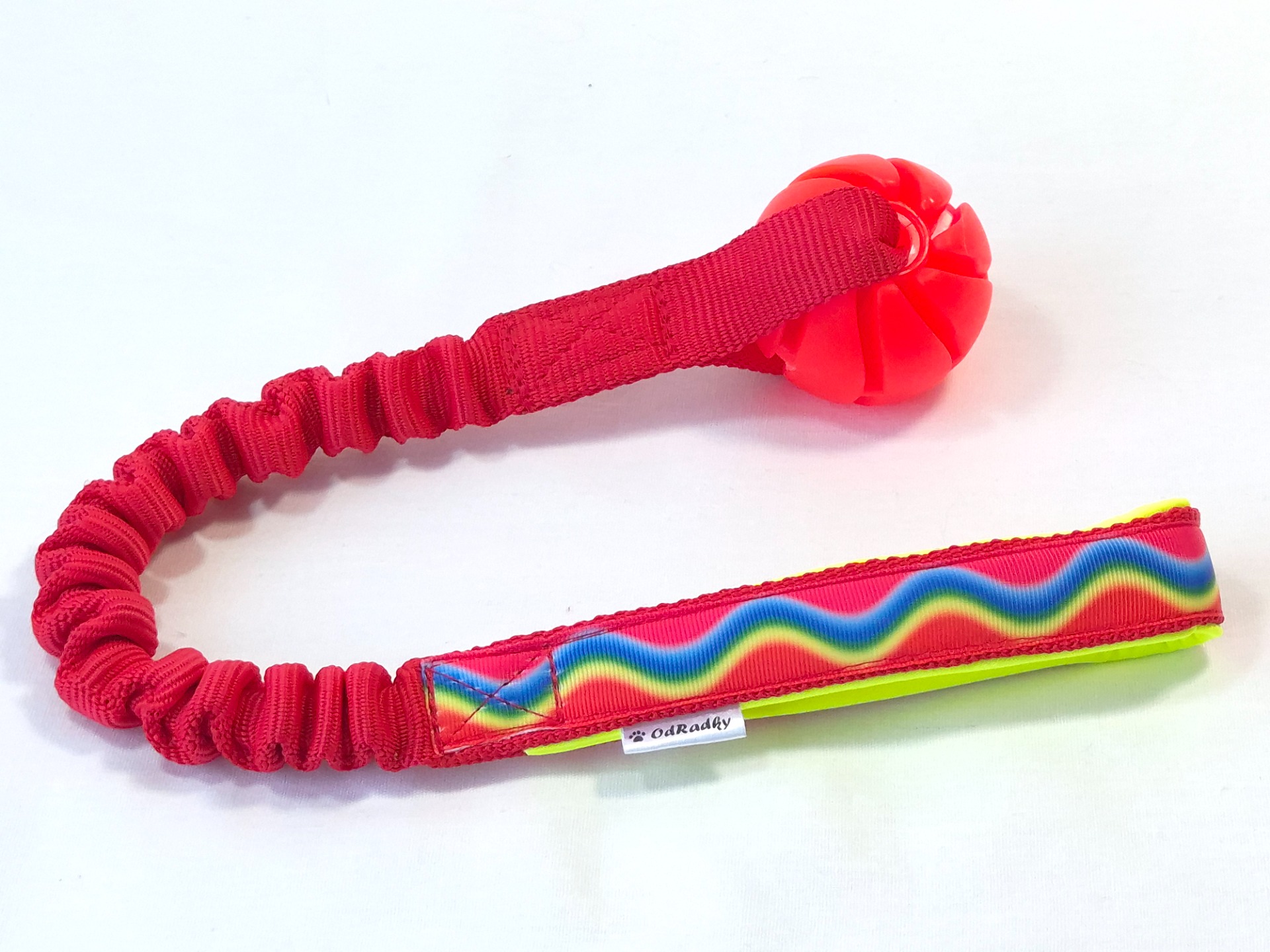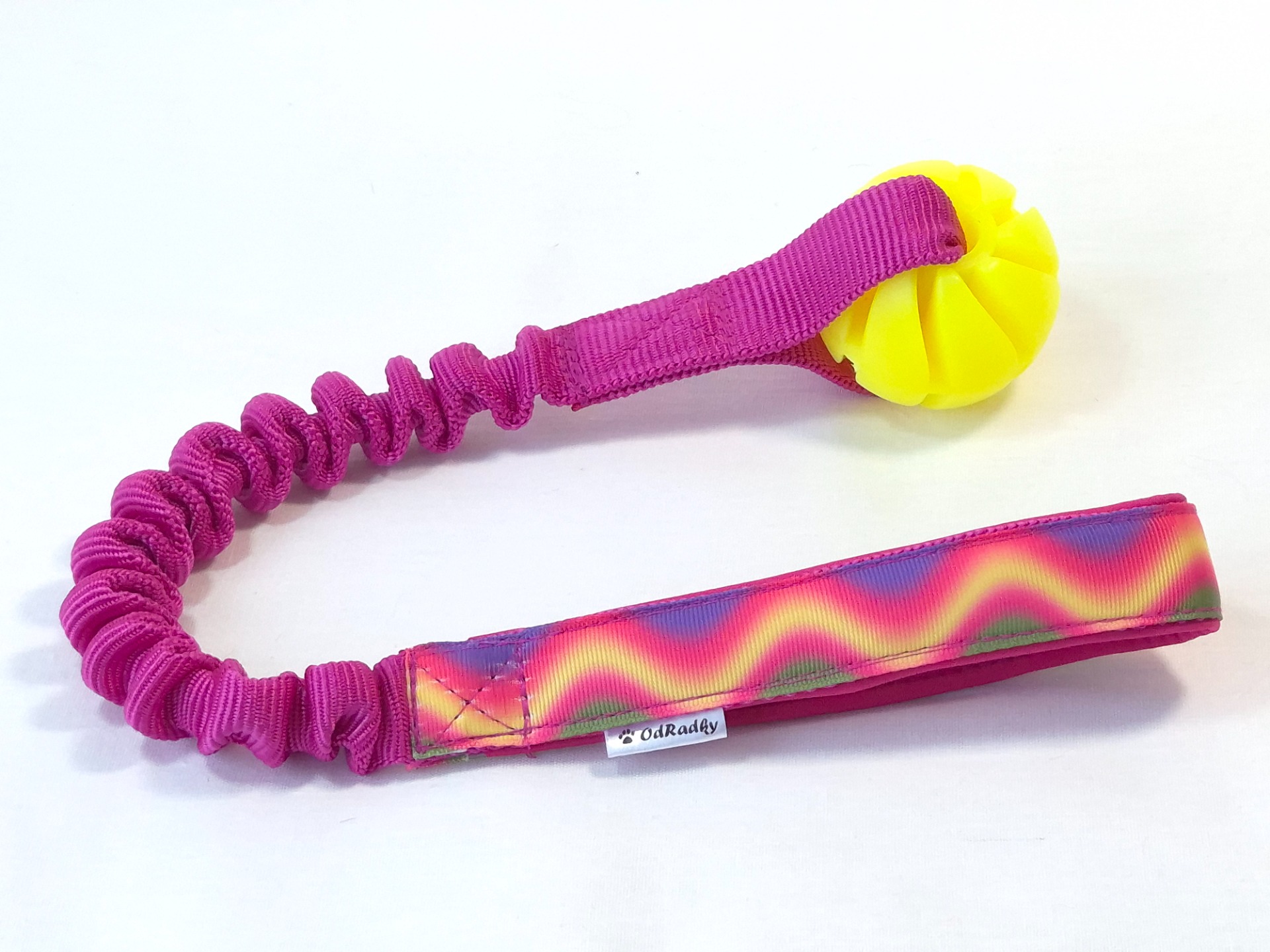 Spirálový odolný míček Sum-plast z tvrdé gumy s vanilkovou vůní a pružným popruhem (amortizérem) s ručkou zdobenou stuhou a podšitou softshellem. Míček je plovoucí a vhodný i do vody.