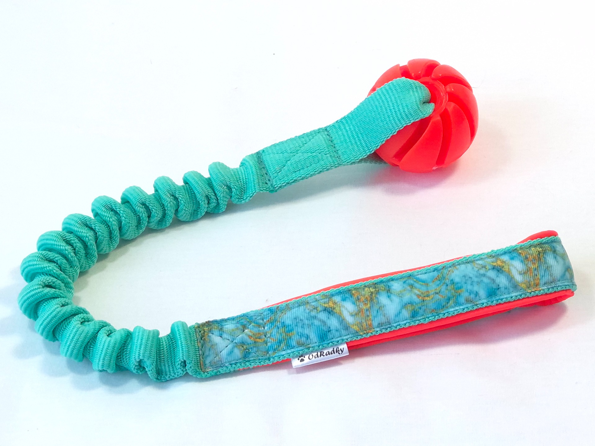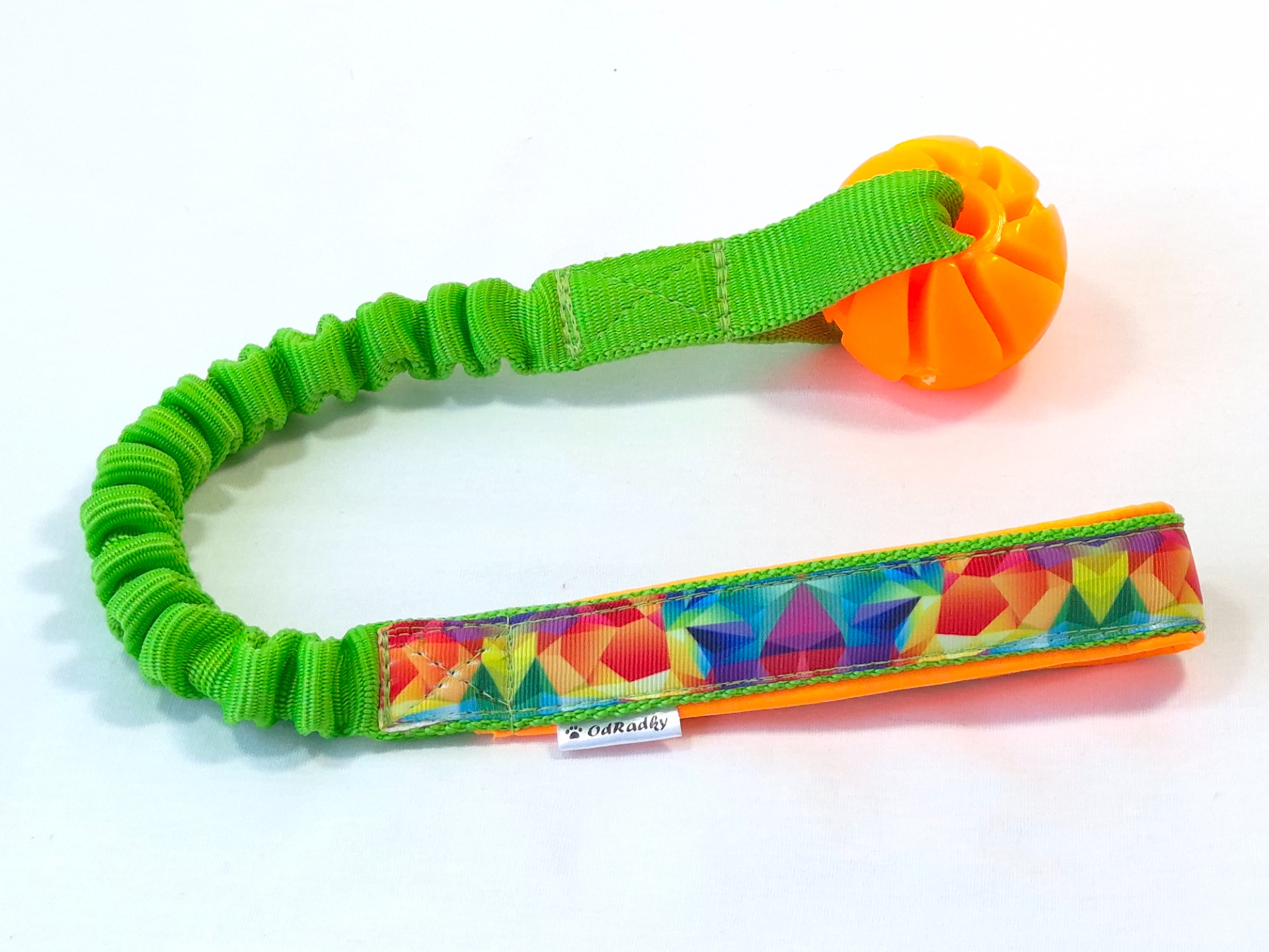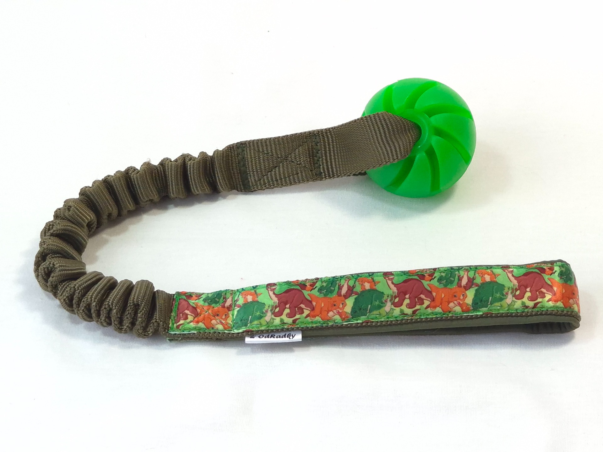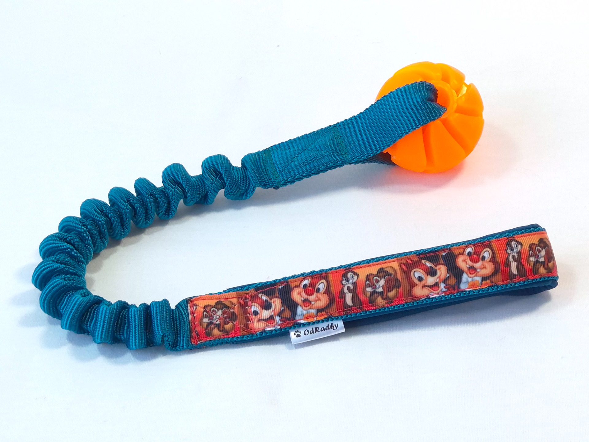Spirálový odolný míček Sum-plast z tvrdé gumy s vanilkovou vůní a pružným popruhem (amortizérem) s ručkou zdobenou stuhou a podšitou softshellem. Míček je plovoucí a vhodný i do vody.
