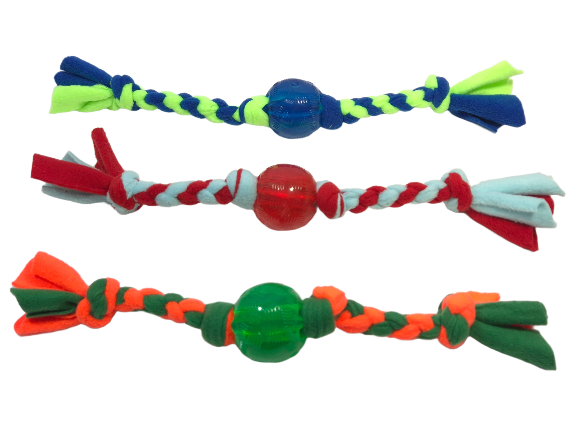 Míček je vyroben ze 100% termoplastické gumy je pevný a odolný, šetrný k psímu chrupu, průměr 6cm , celková délka hračky okolo 45 cm.