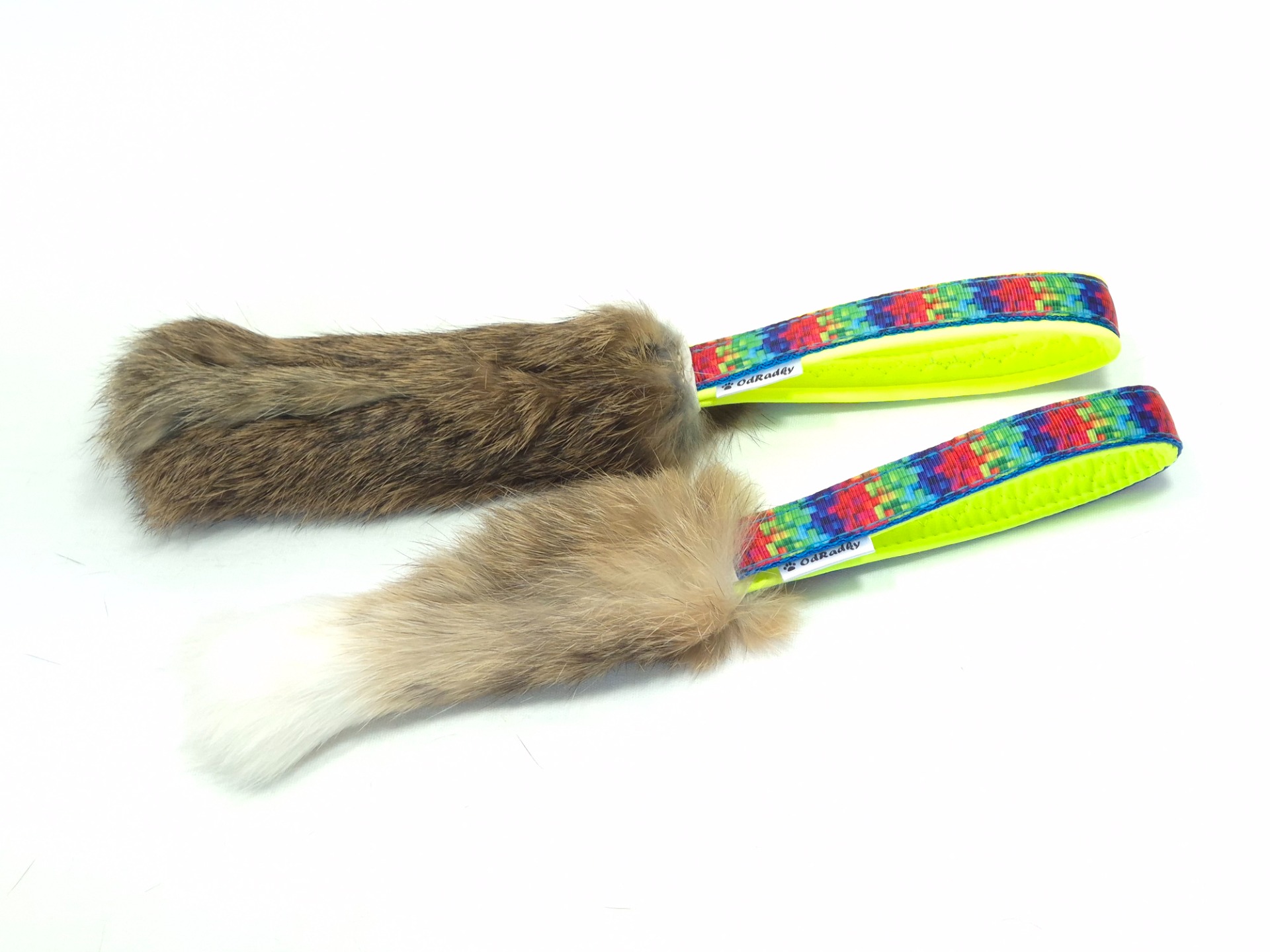 Vyrobeno z pravé králičí kožešiny našité na popruhu s ručkou. Celková délka hračky okolo 25cm, kožešinová část cca 10cm.