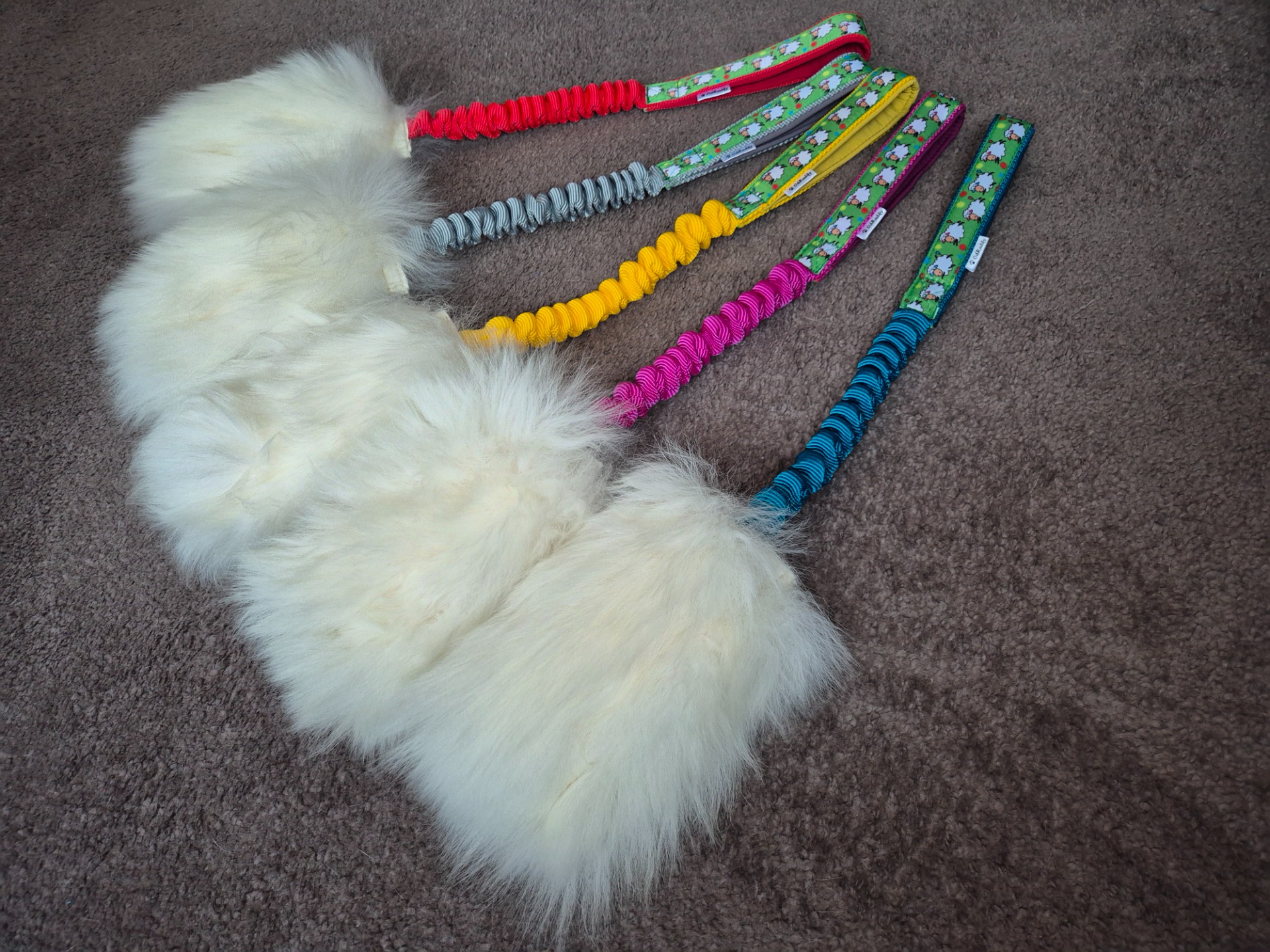 Hračka je vyrobena z pravé ovčí kožešiny. Uvnitř kožešinové části je kapsička na pamlsky s otvorem z boku.  Velikost kožešinové části malá  15x7cm, velká 20x7cm. V celé délce, pro lepší pevnost vede popruh.  Délka amortizéru 35 cm, po natažení cca 60 cm, rukojeť je podšitá softshellem.