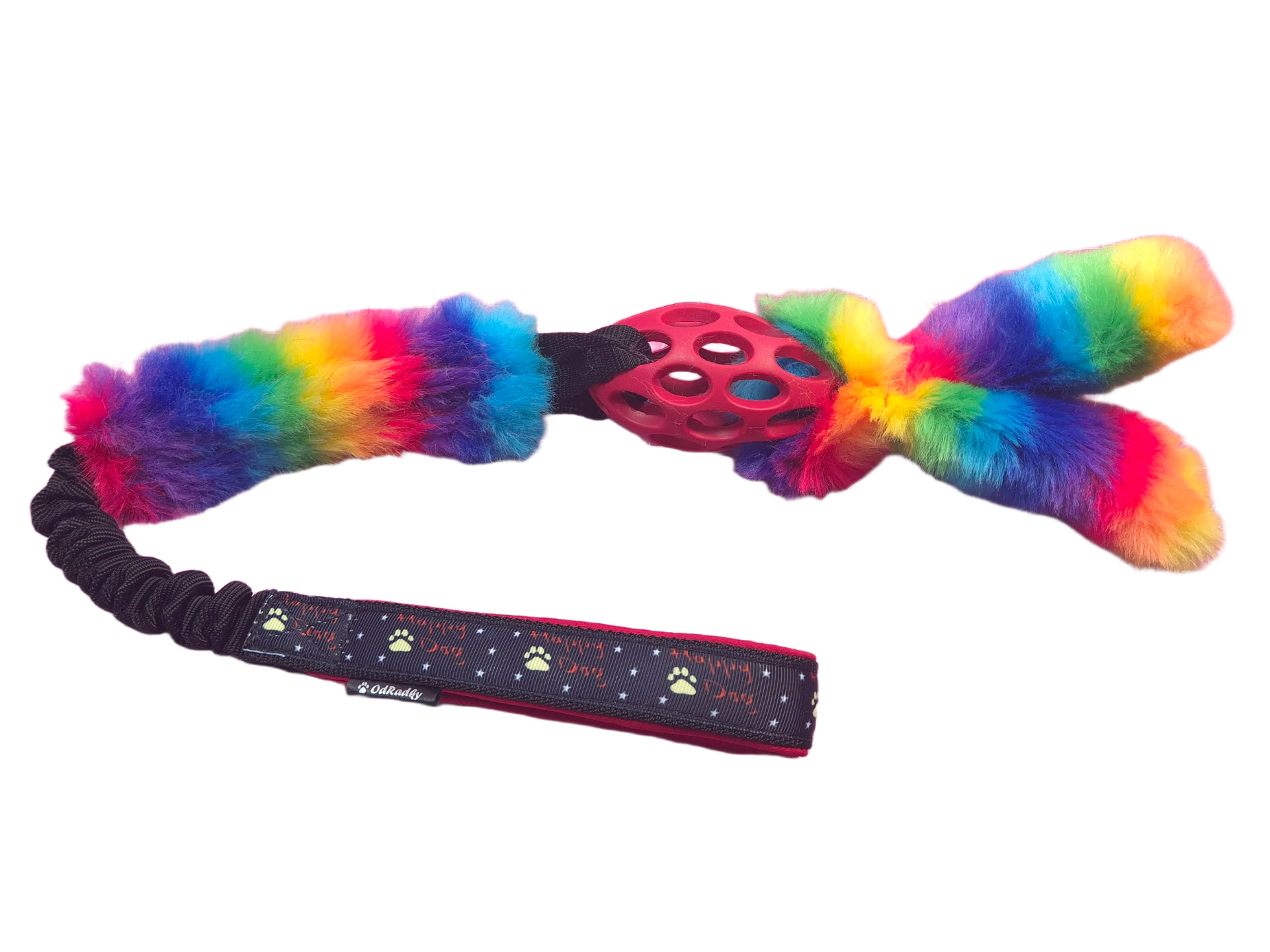 Pro větší pevnost vede popruh v celé délce hračky. Kožešinová část cca 13x3cm našitá na popruhu. Délka amortizéru s ručkou 25cm po natažení 30cm, ručka podšitá softshellem, kožešinový střapec 2x 13×4cm,  JW rugby mini 9x5cm. Celková délka hračky 60 cm.