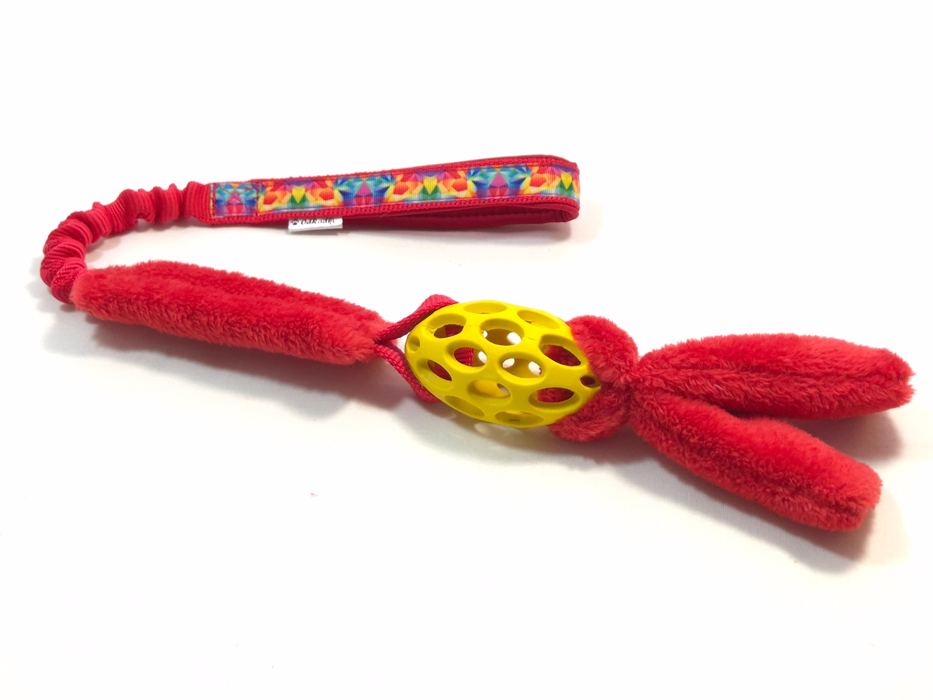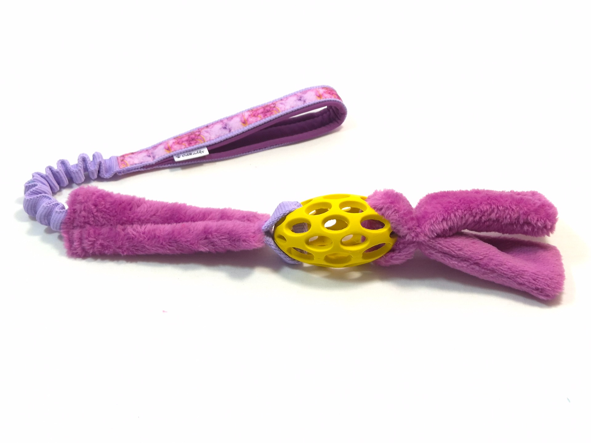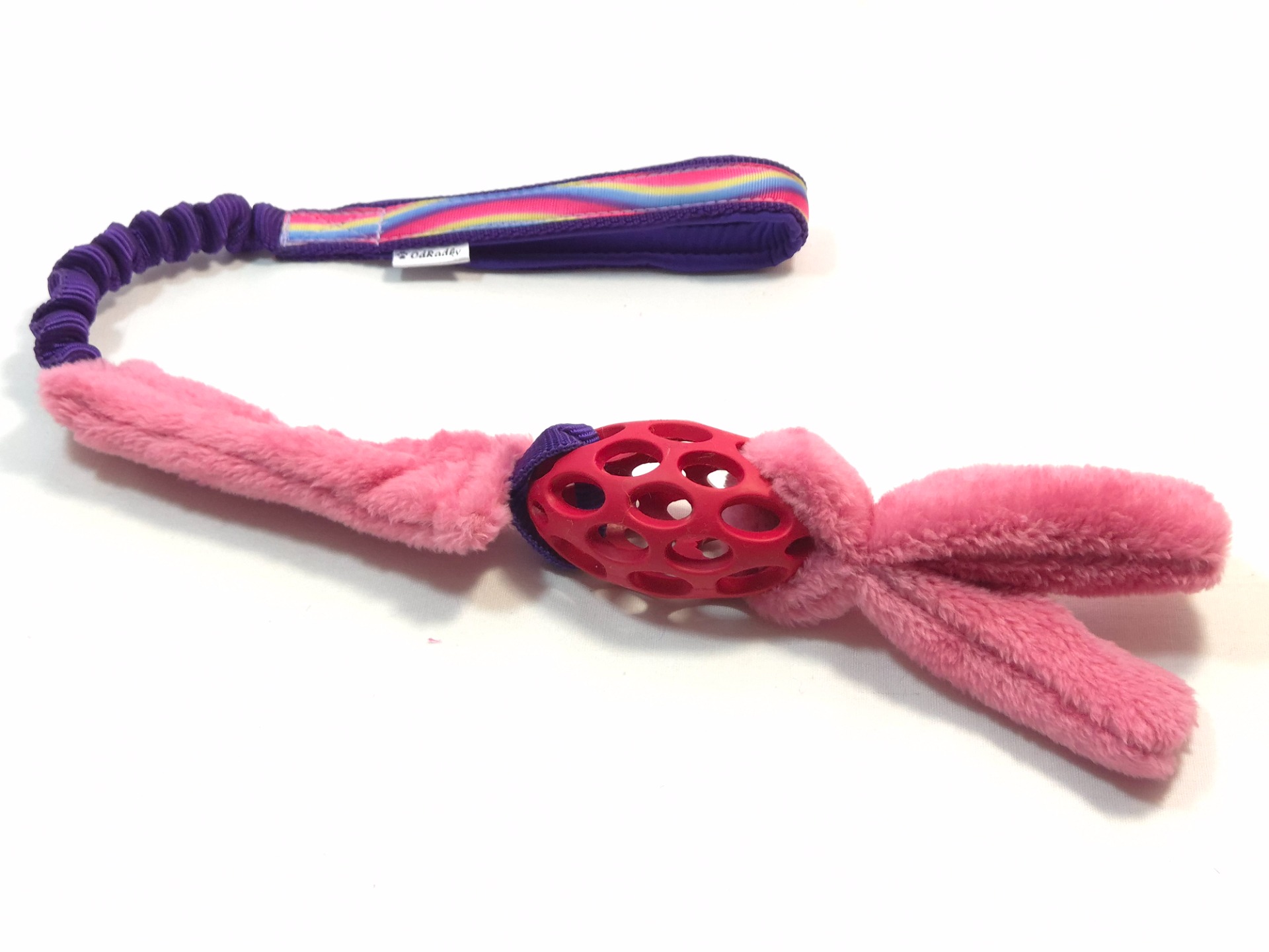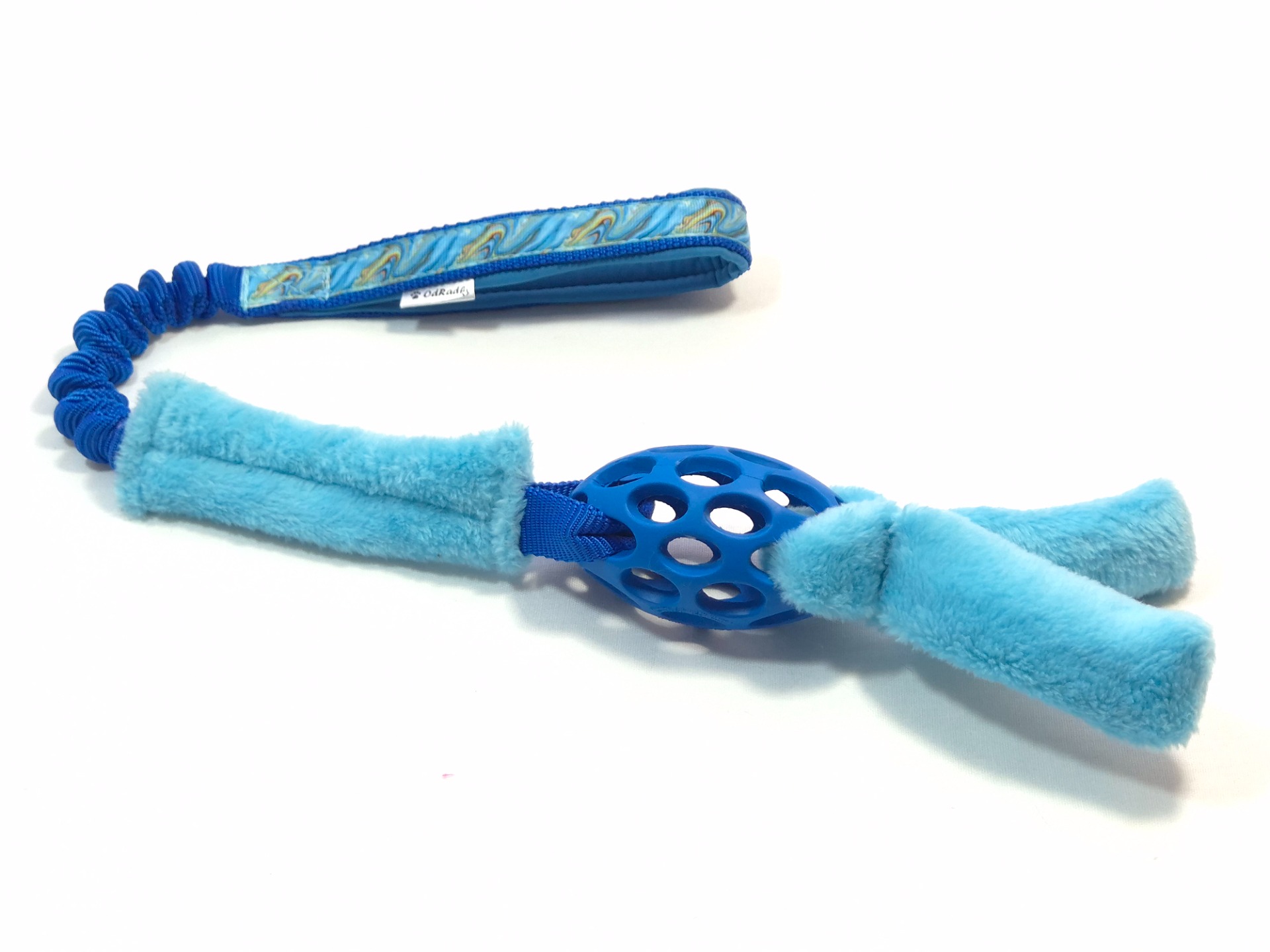 Pro větší pevnost vede popruh v celé délce hračky. Kožešinová část cca 13x3cm našitá na popruhu. Délka amortizéru s ručkou 25cm po natažení 30cm, ručka podšitá softshellem, kožešinový střapec 2x 13×4cm, JW rugby mini 9x5cm. Celková délka hračky 60 cm.