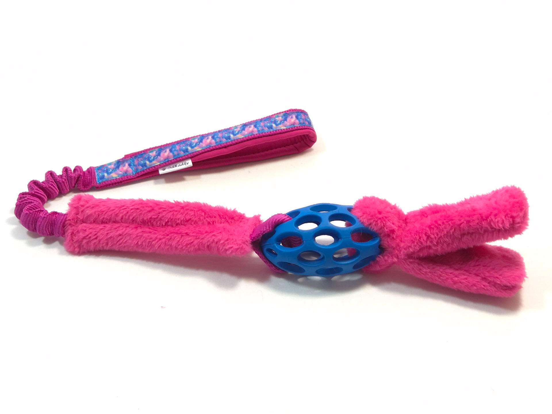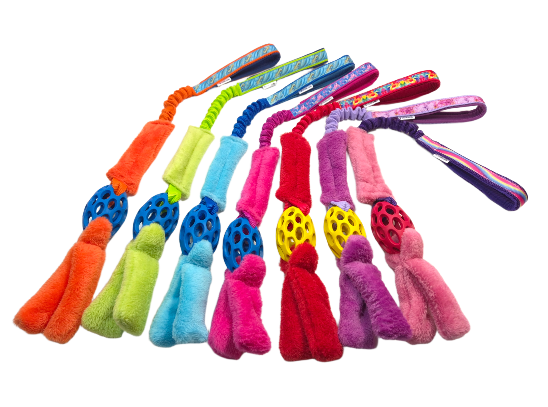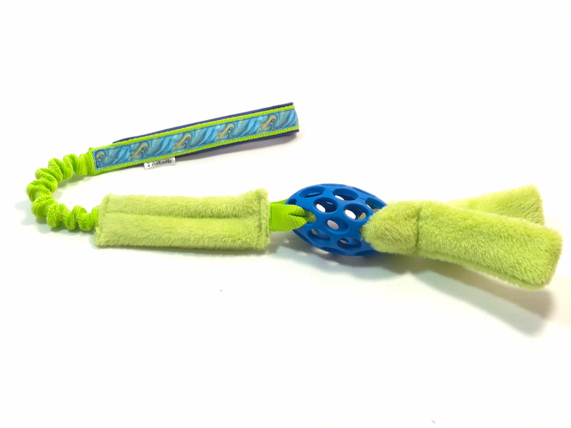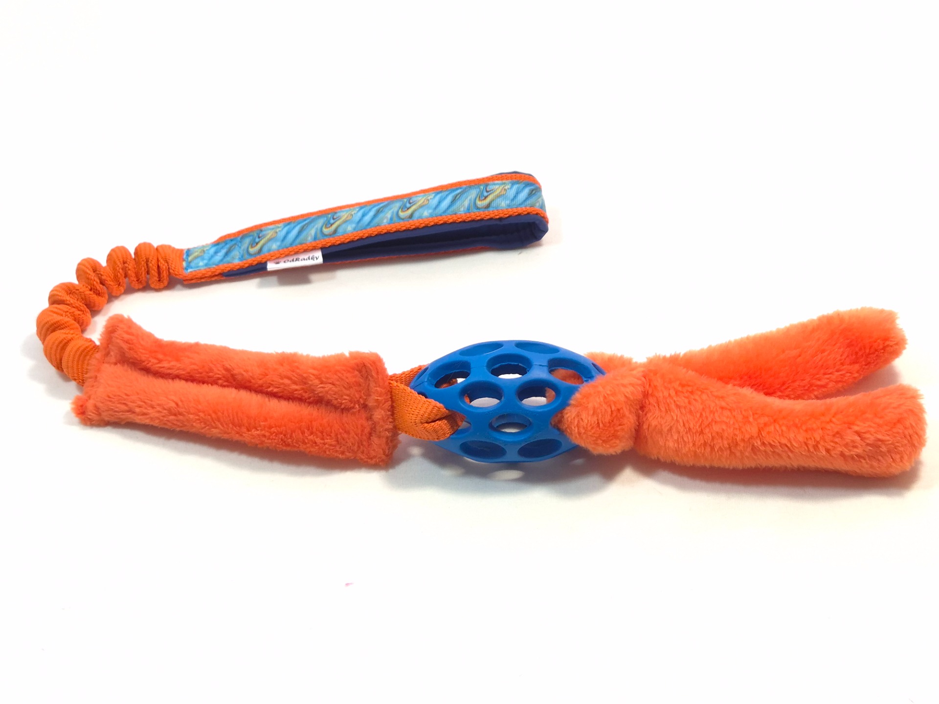 Pro větší pevnost vede popruh v celé délce hračky. Kožešinová část cca 13x3cm našitá na popruhu. Délka amortizéru s ručkou 25cm po natažení 30cm, ručka podšitá softshellem, kožešinový střapec 2x 13×4cm, JW rugby mini 9x5cm. Celková délka hračky 60 cm.