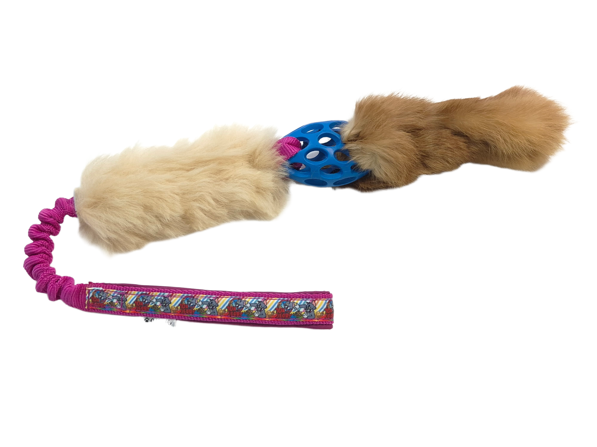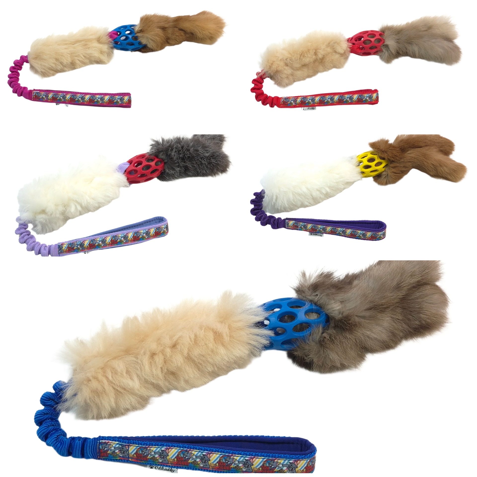 Parametry: amortizér s ručkou 25 cm, ovčí kožešina cca 15 x 3 cm, králičí střapec 2 x 15 cm, JW rugby mini 9x5cm. Celková délka hračky 65cm.