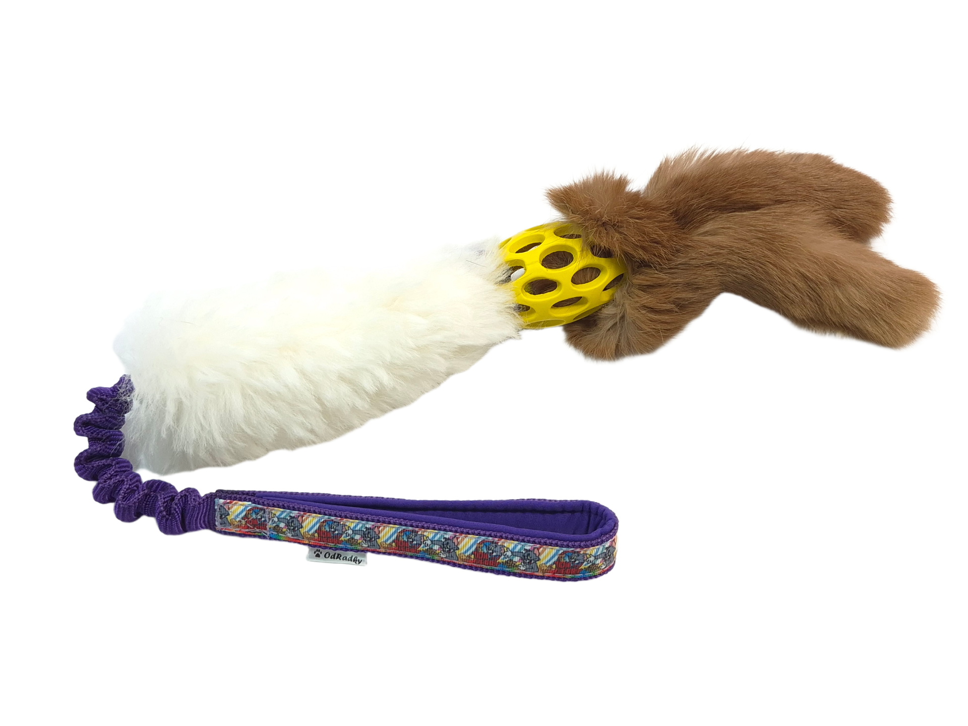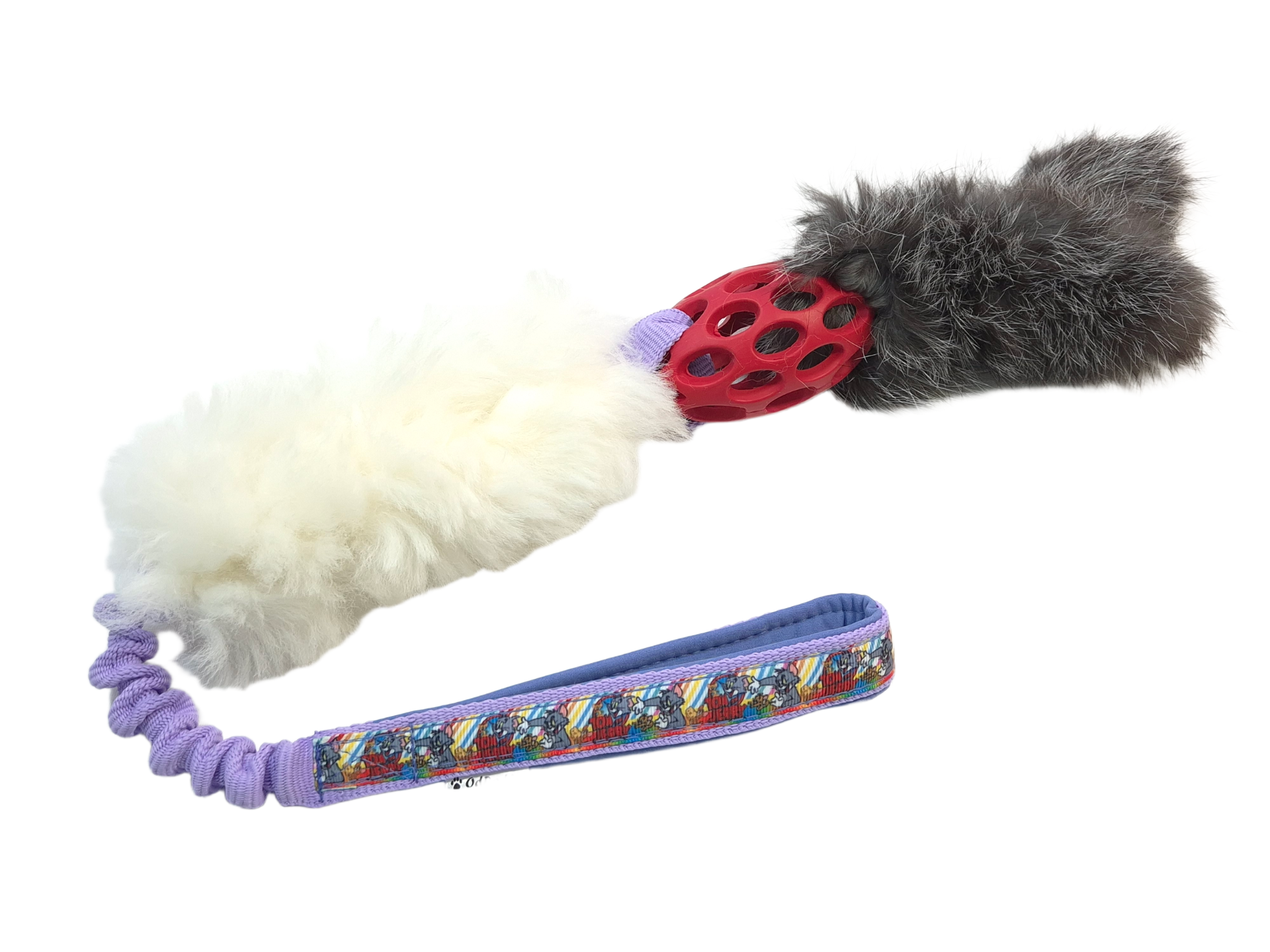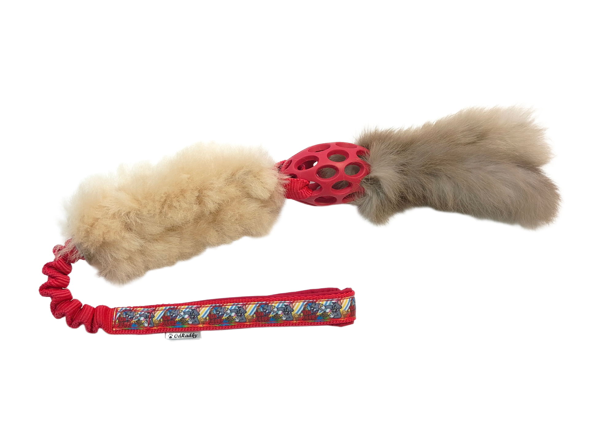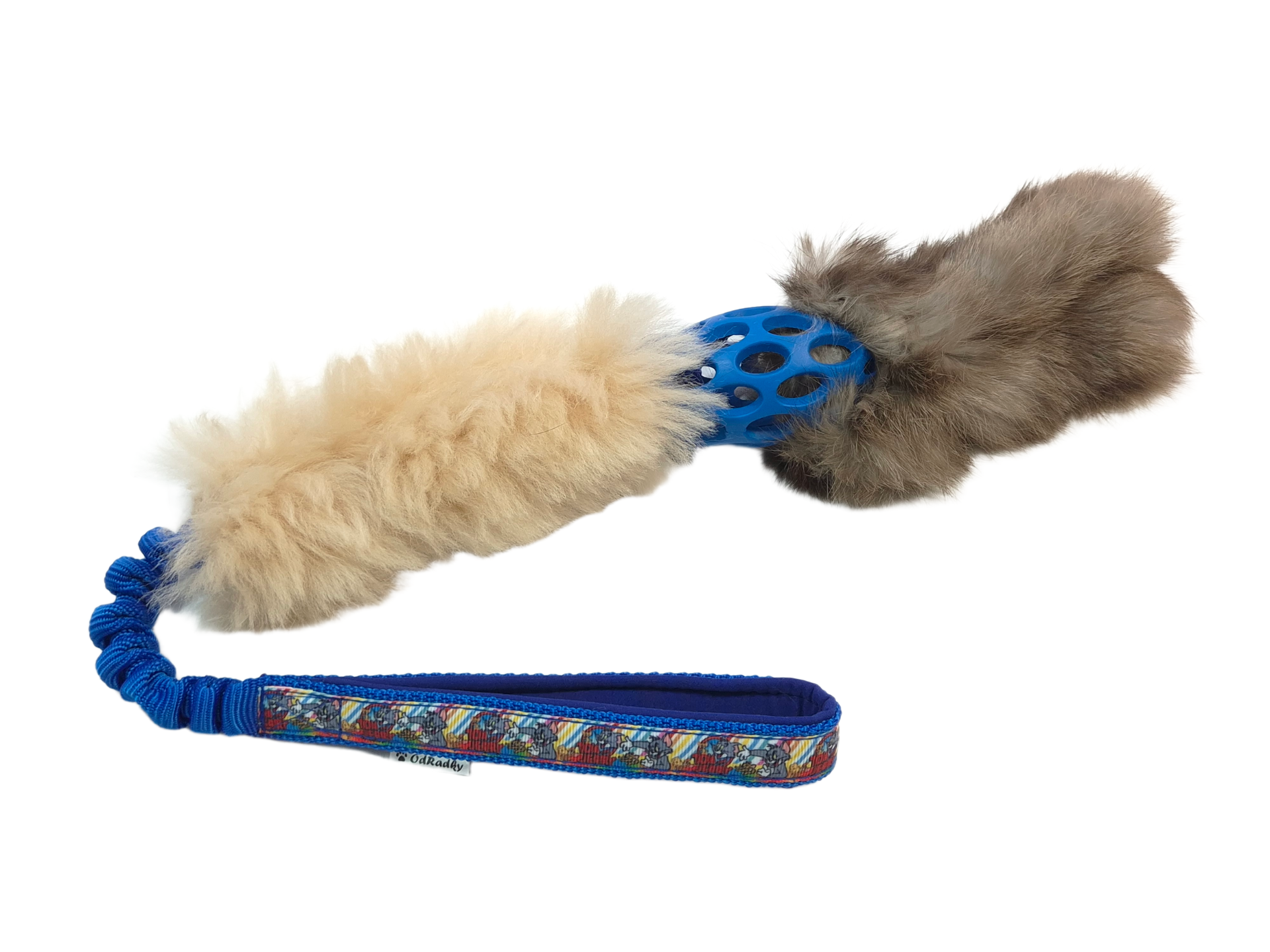 Přetahovadlo je vyrobeno z pravé ovčí kožešiny ( cca 15x3cm) našité na pružném popruhu ( amortizéru) s ručkou podšitou softshellem, JW rugby mini míčku a dvou střapců z pravé králičí kožešiny.