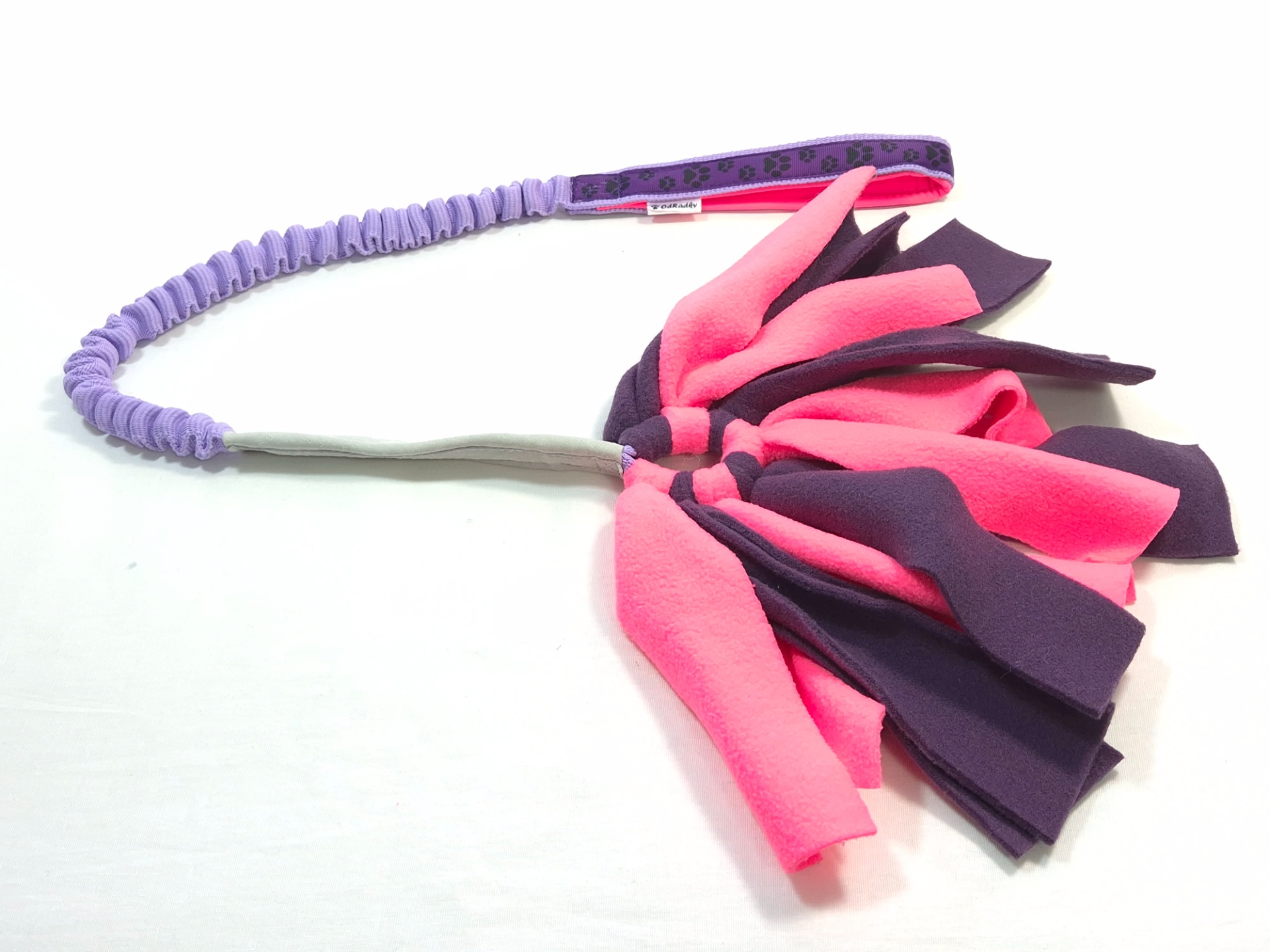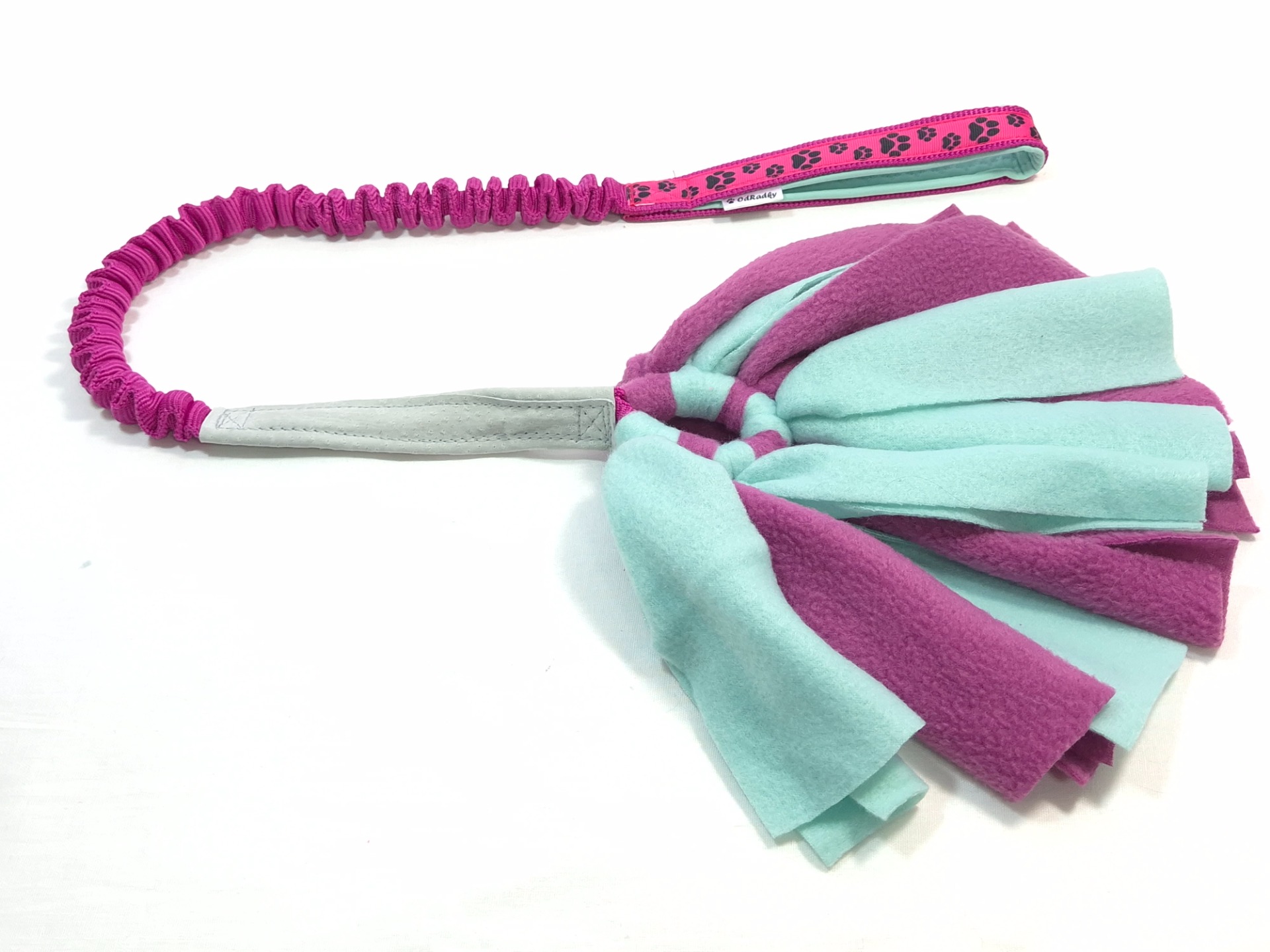 Střapec je z fleecu na pružném popruhu (amortizéru), ručka je podšita softshellem, popruh mezi míčkem a amortizérem je obšit přírodní vepřovou kůží, která je šetrná k psím zubům.