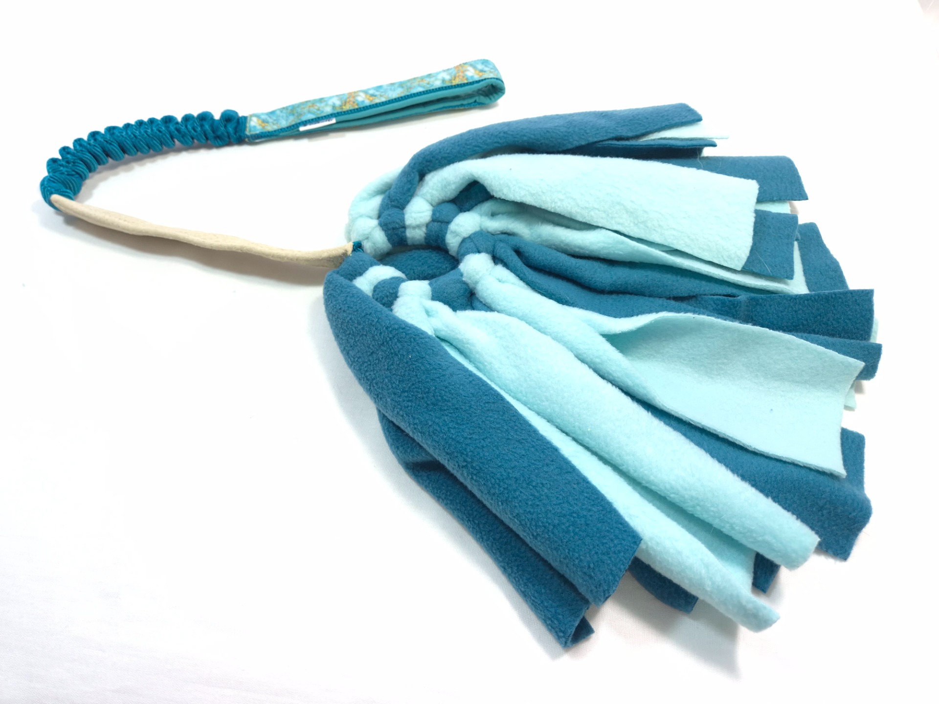 Střapec je z fleecu na pružném popruhu (amortizéru), ručka je podšita softshellem, popruh mezi míčkem a amortizérem je obšit přírodní vepřovou kůží, která je šetrná k psím zubům.