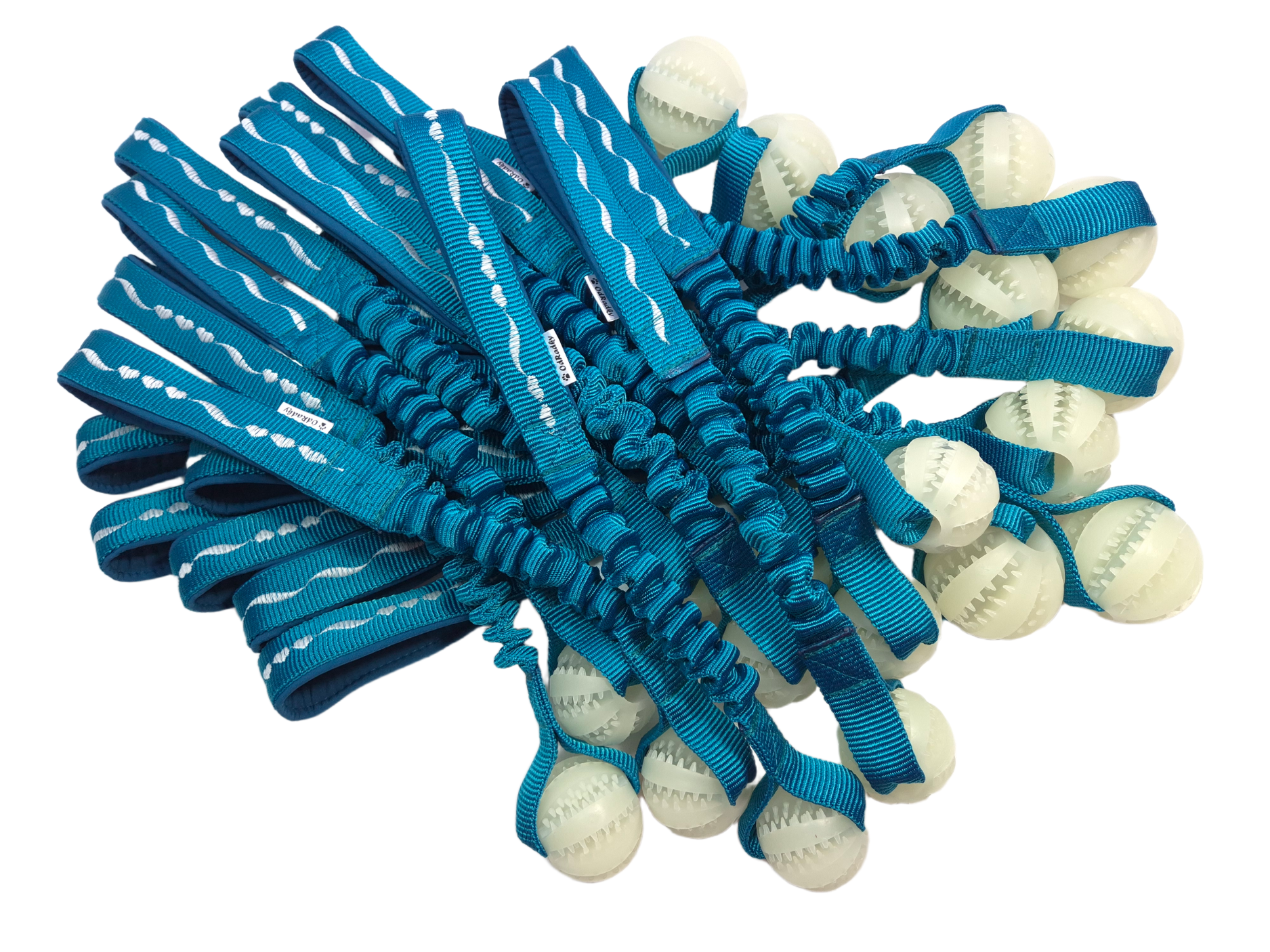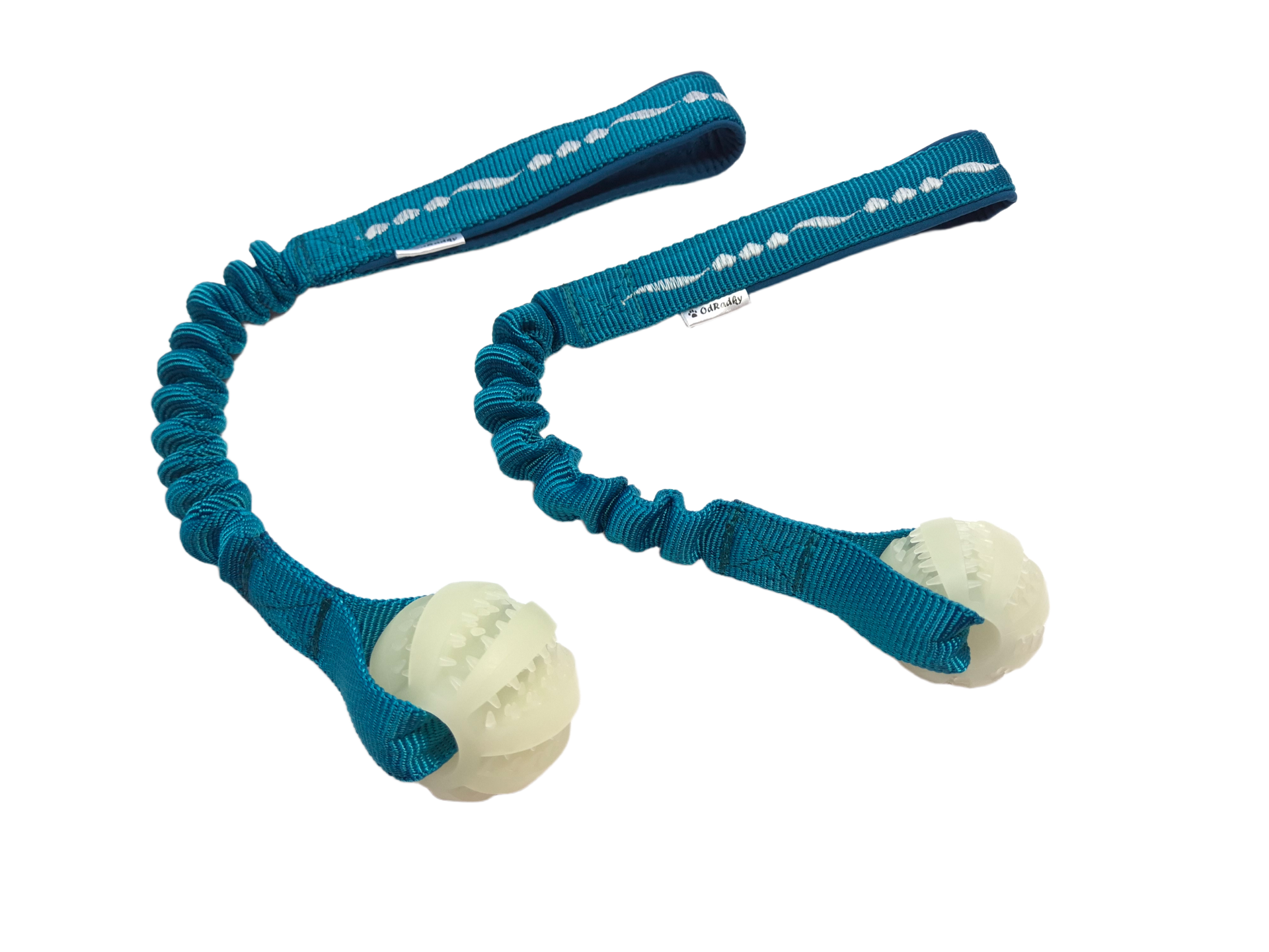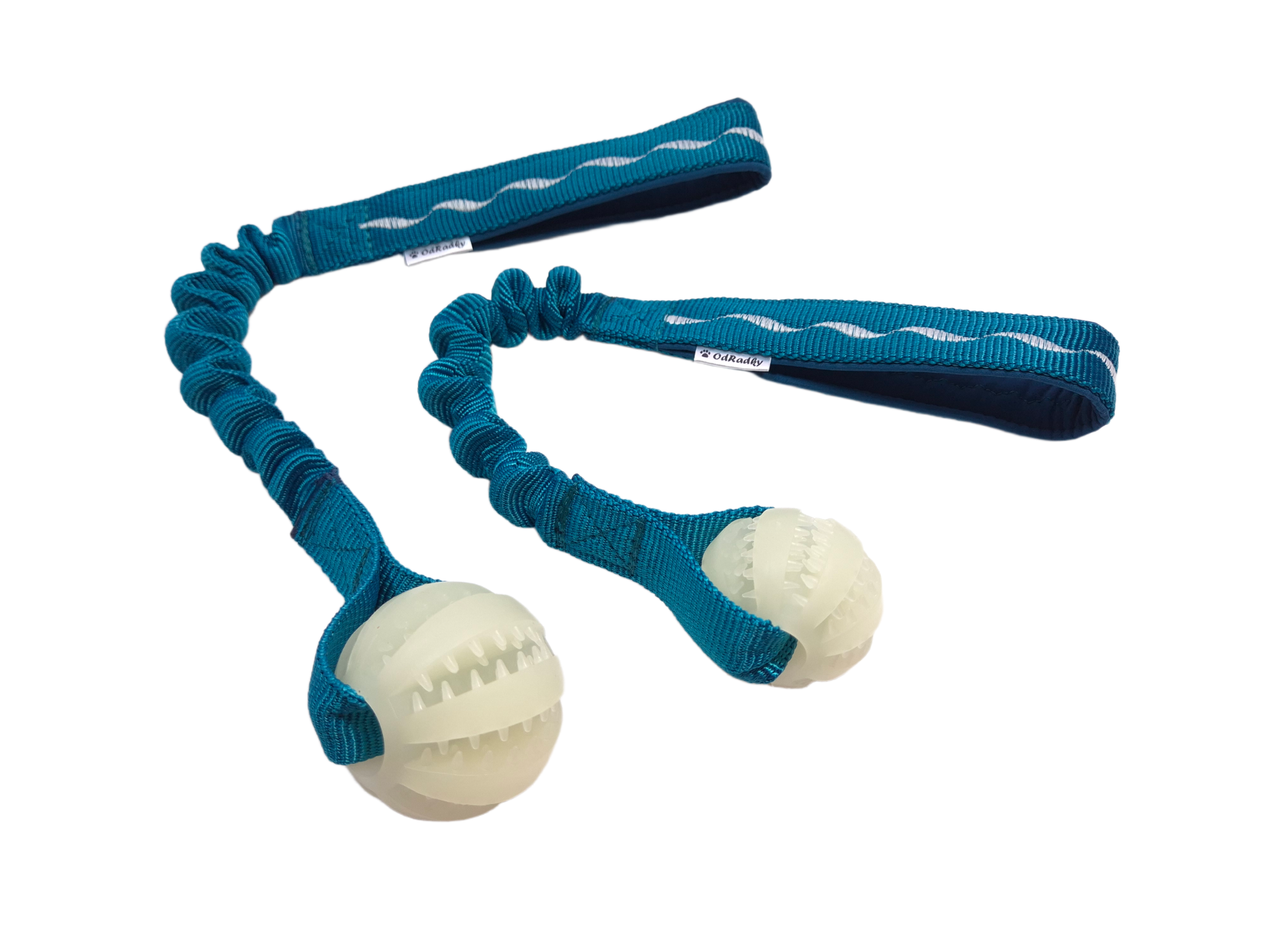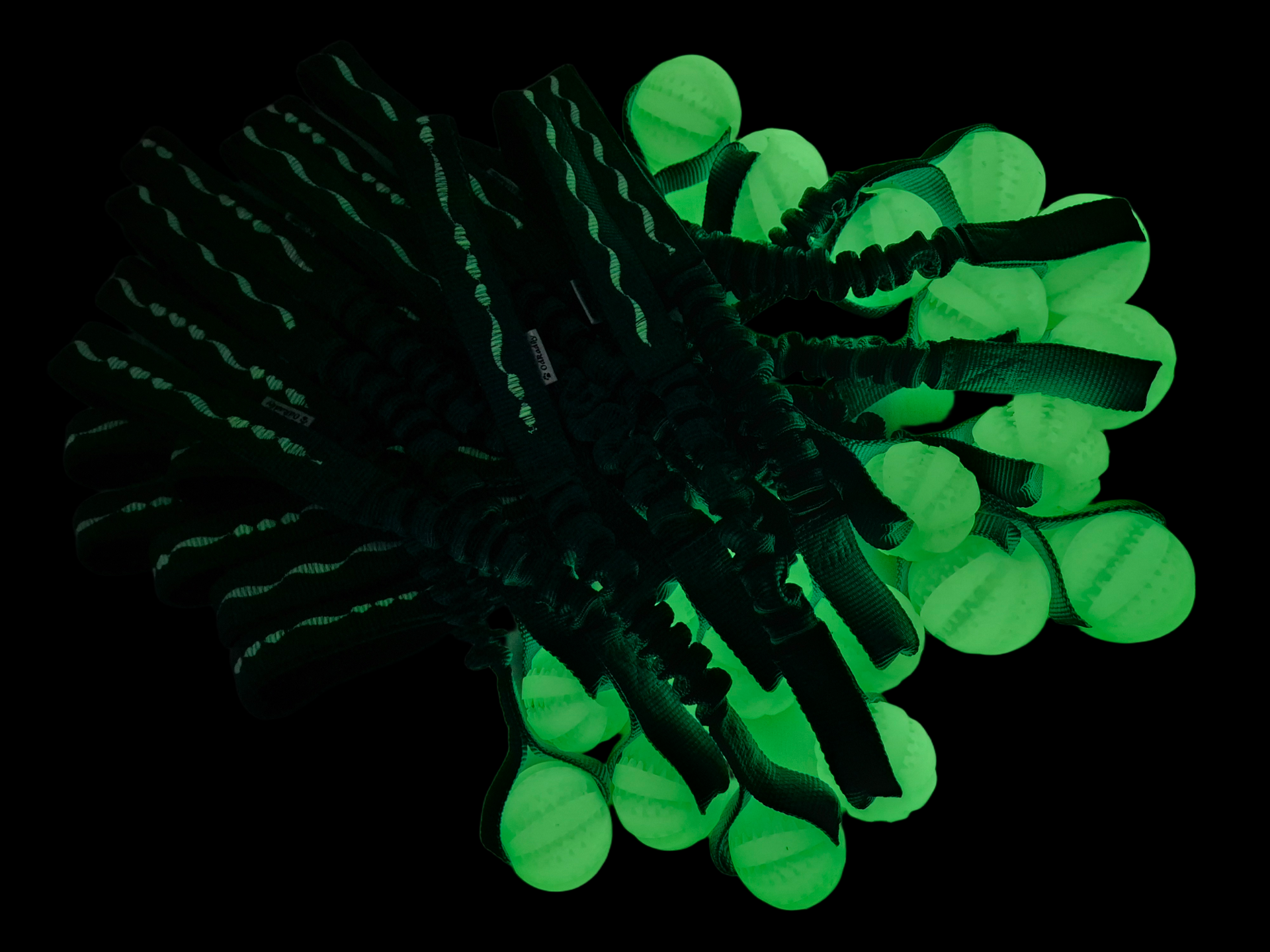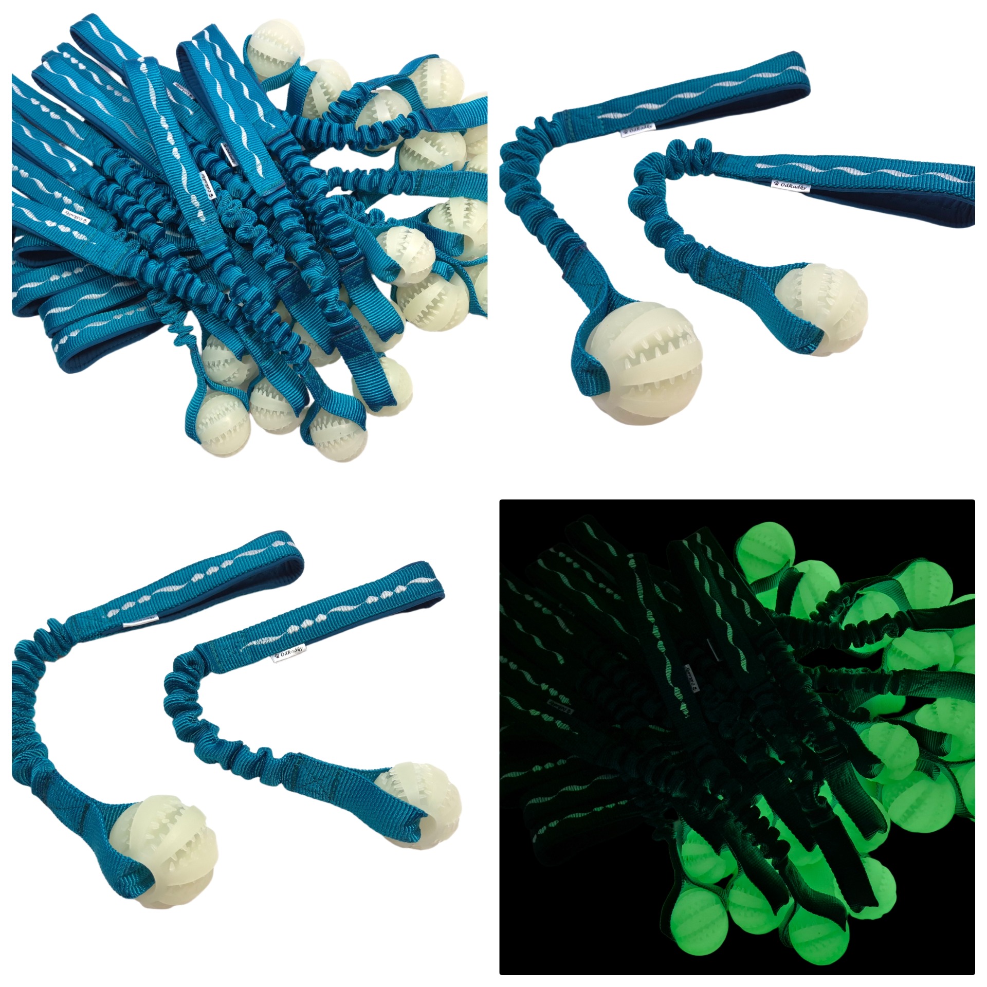 Míček ve dvou velikostech : o průměru 4cm nebo 5cm z měkké, ale odolné fosforeskující gumy na pružném popruhu ( amortizéru ) s ručkou podšitou softshellem a zdobenou výšivkou s fosforeskující nítí. Celková délka hračky s amortizérem a míčkem 4cm/40cm, 5cm/45cm.